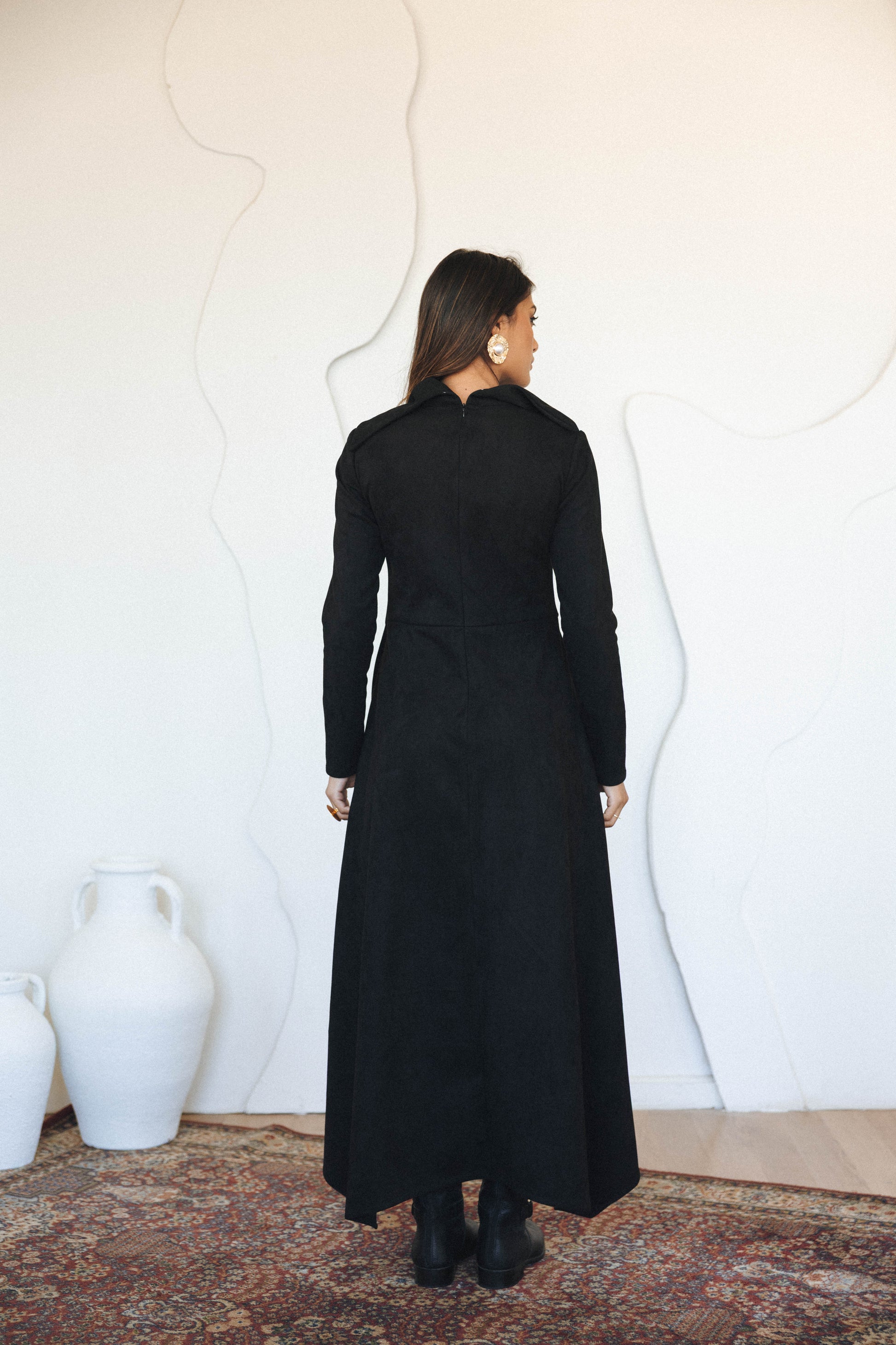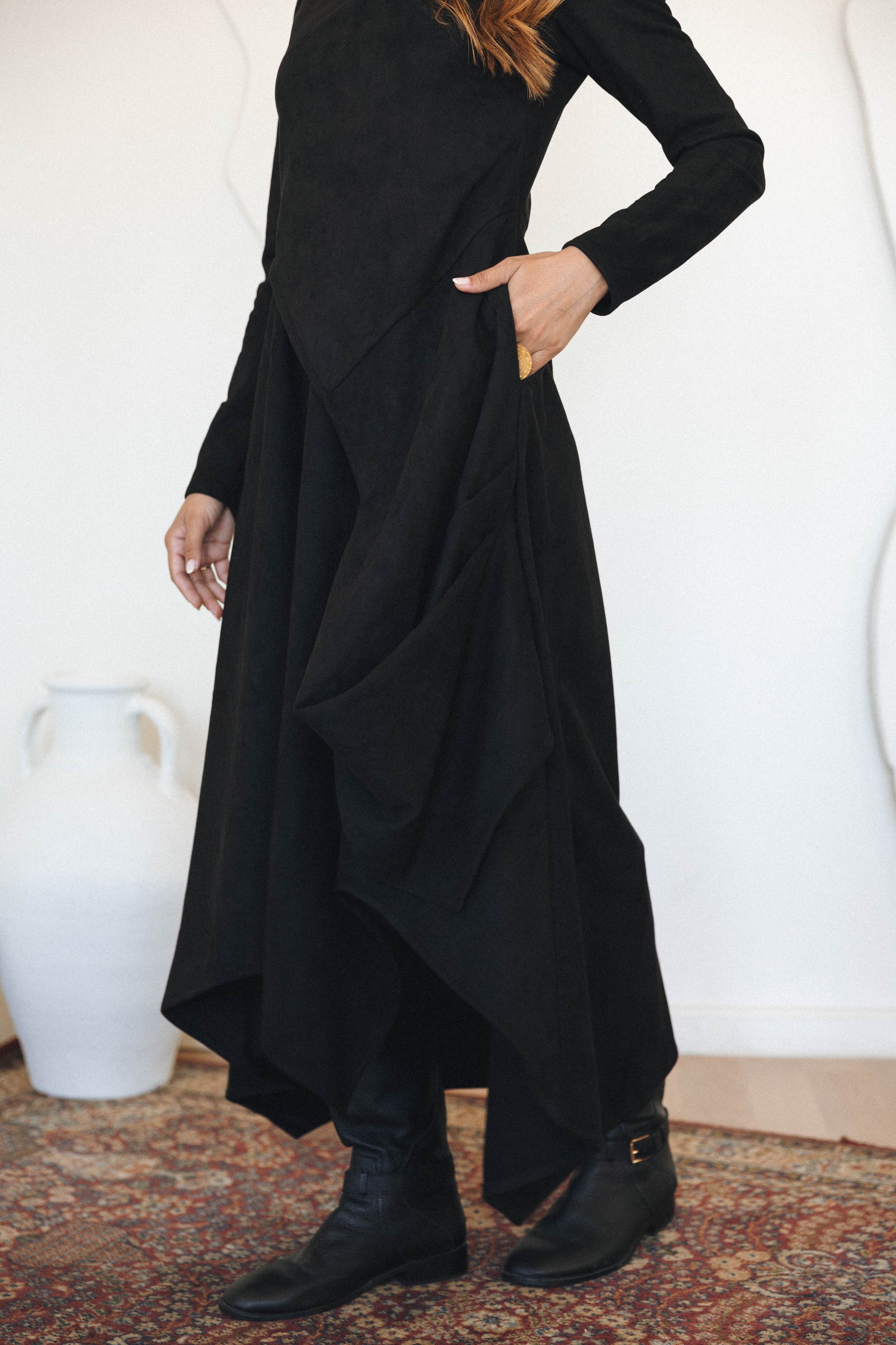 A sculpted midi dress crafted from suede fabric, designed with an elegant asymmetrical drape that flows effortlessly with every step. Featuring a refined high neckline and long sleeves, this piece blends modern structure with fluid movement for a timeless, elevated look—perfect for day-to-evening wear.