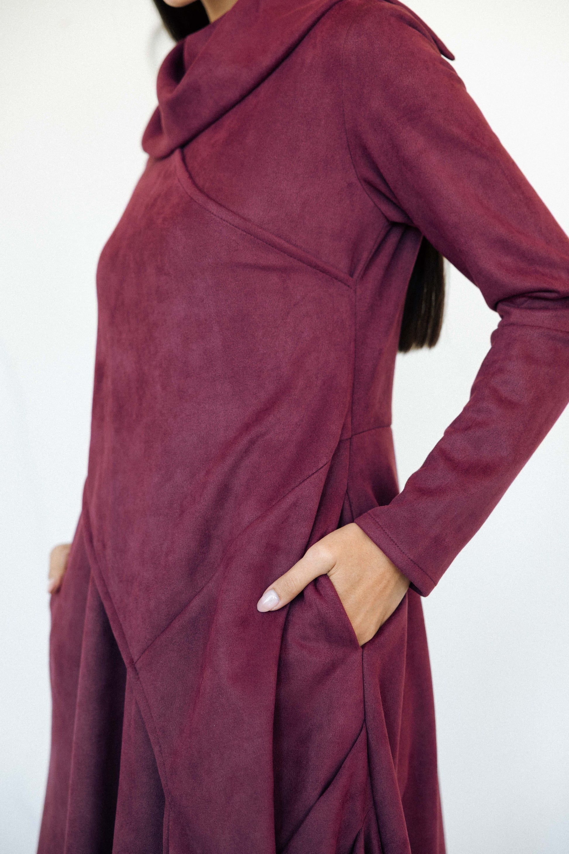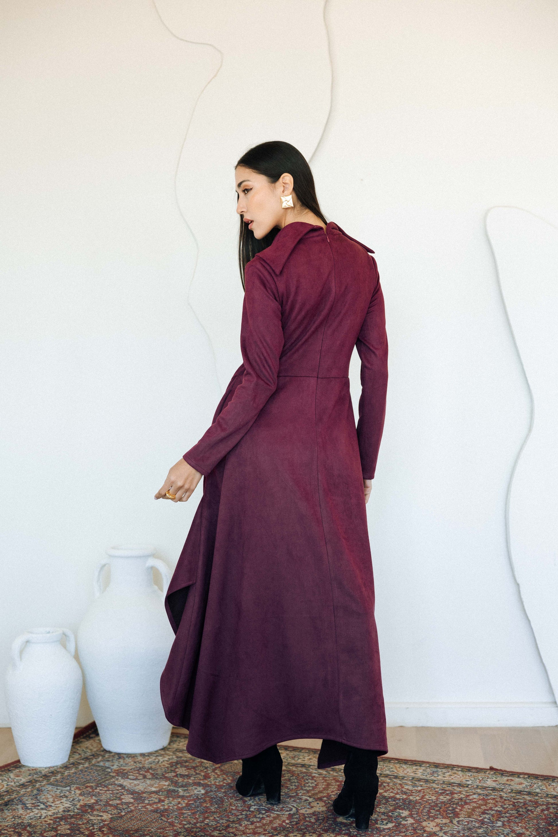 A sculpted midi dress crafted from suede fabric, designed with an elegant asymmetrical drape that flows effortlessly with every step. Featuring a refined high neckline and long sleeves, this piece blends modern structure with fluid movement for a timeless, elevated look—perfect for day-to-evening wear.