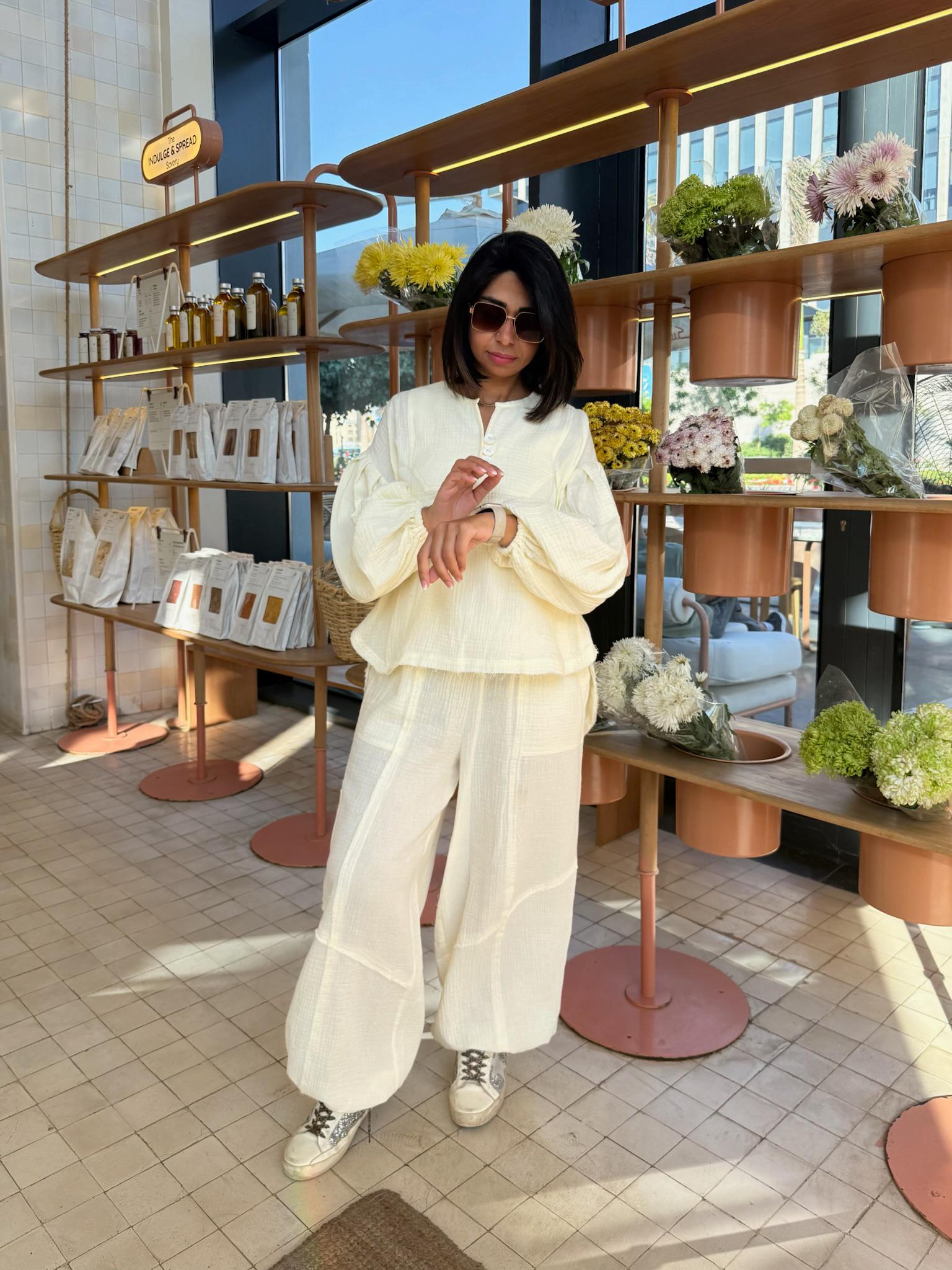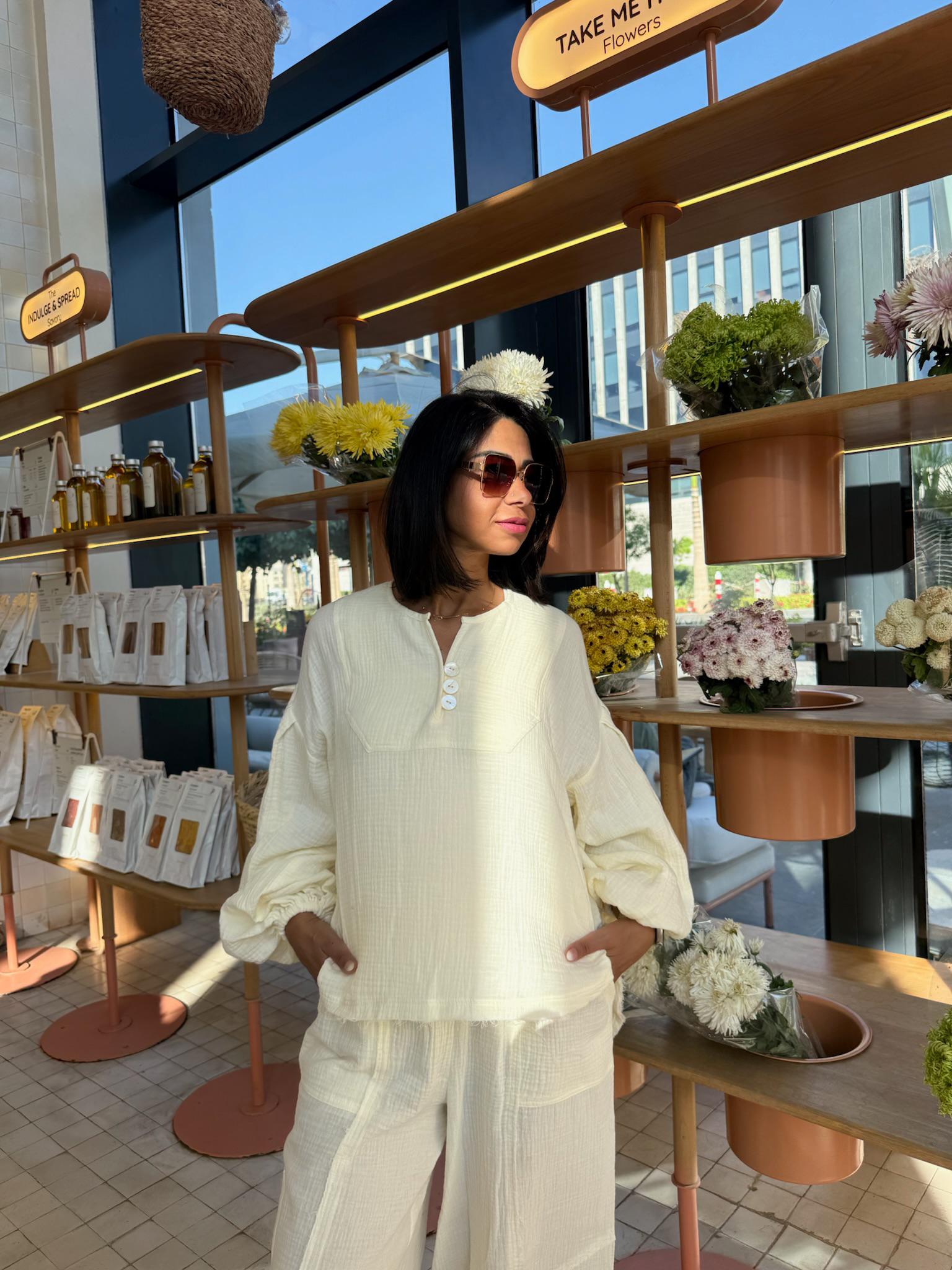The outfit in the image features a relaxed and elegant co-Ord set, ideal for a chic casual or resort-style look.