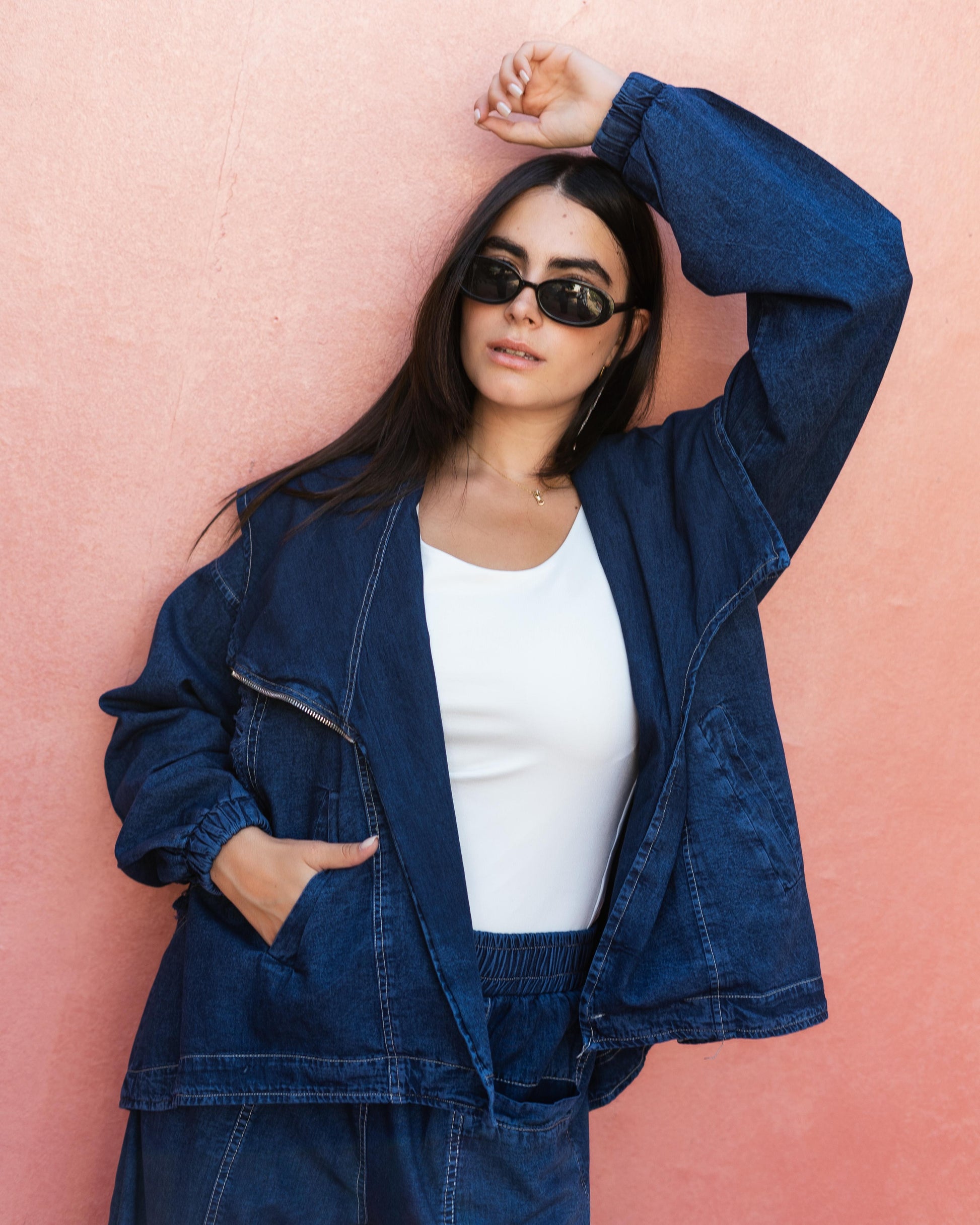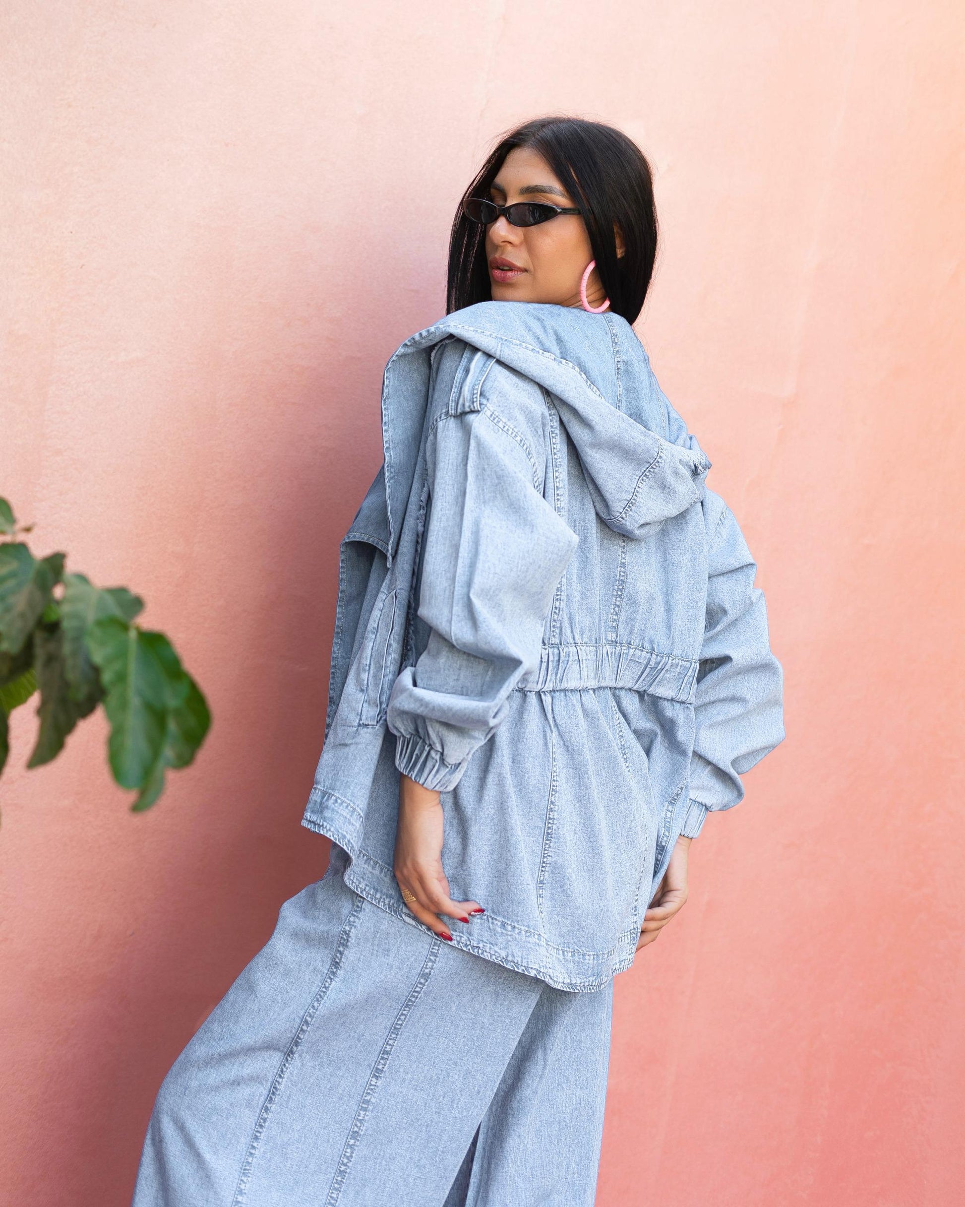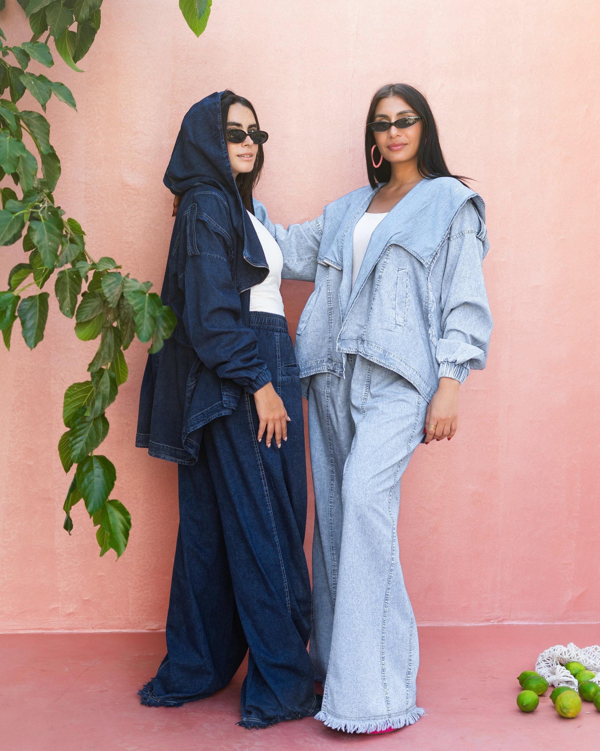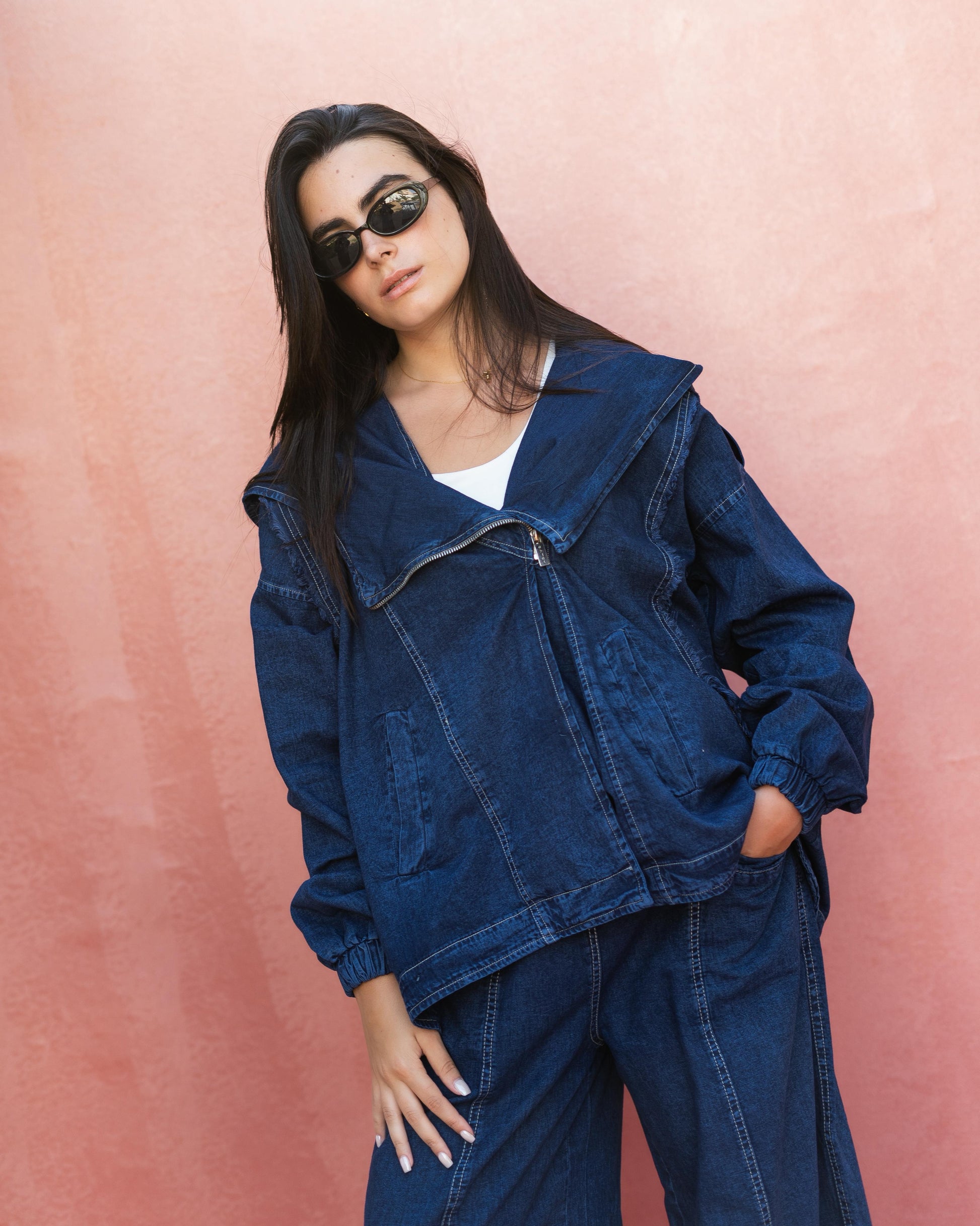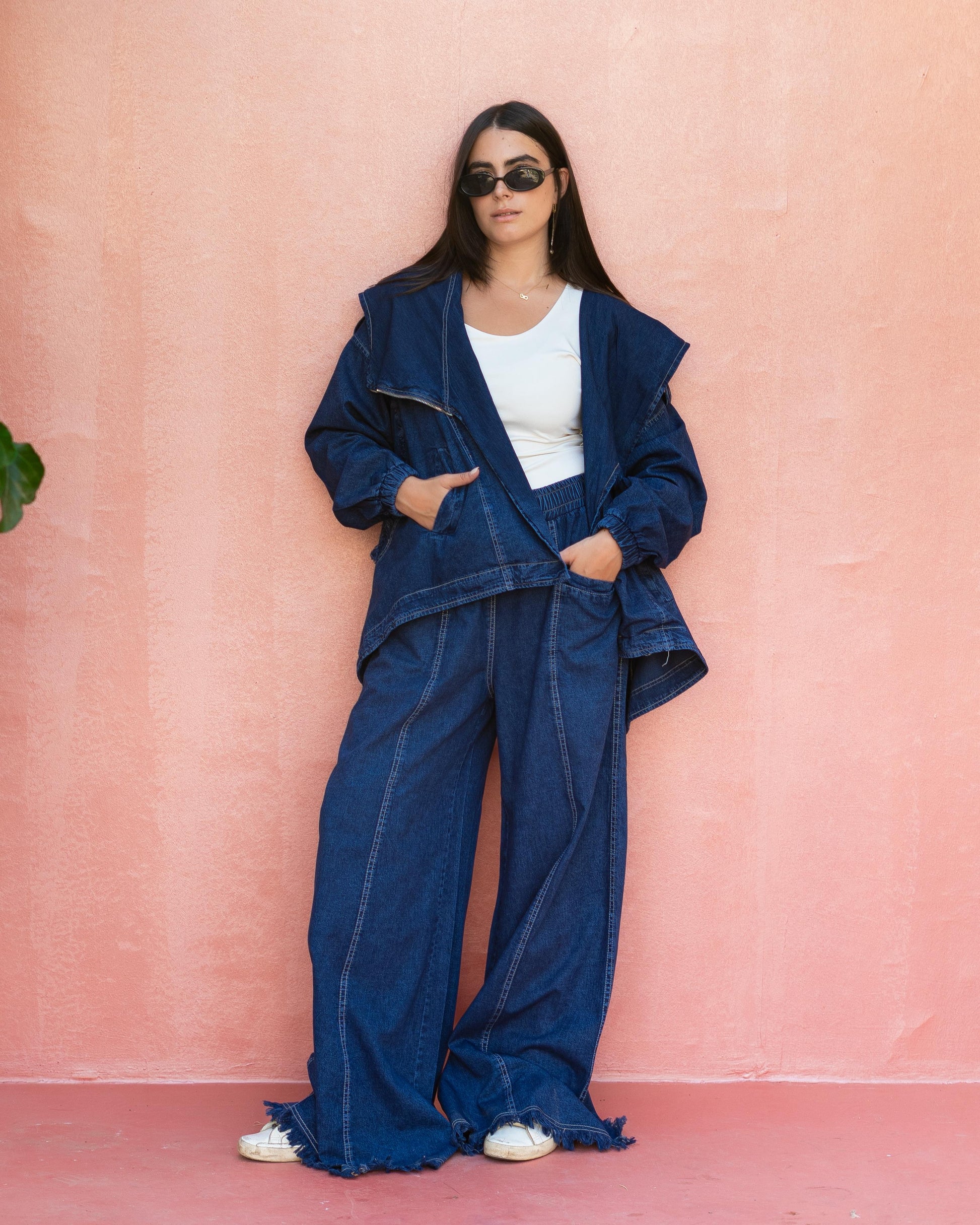 Make a bold statement with our oversized denim co-ord set, designed for effortless edge and all-day comfort. this set includes a relaxed zip-up jacket with drop shoulders and functional pockets, paired with wide-leg trousers.