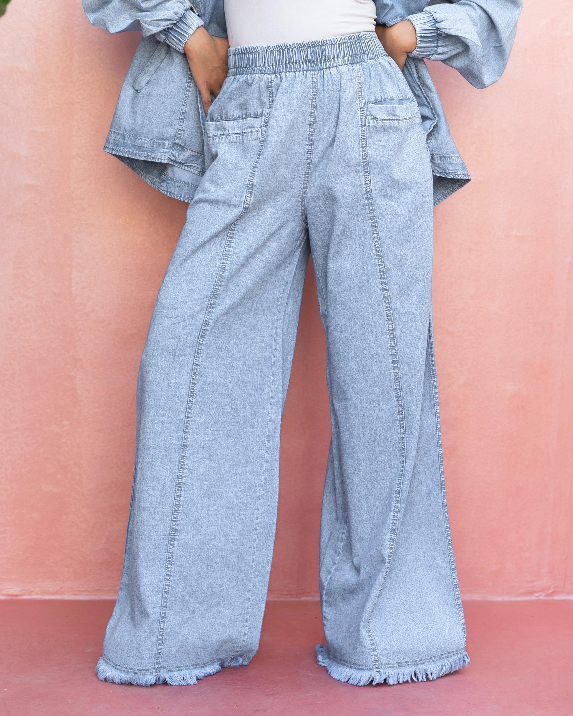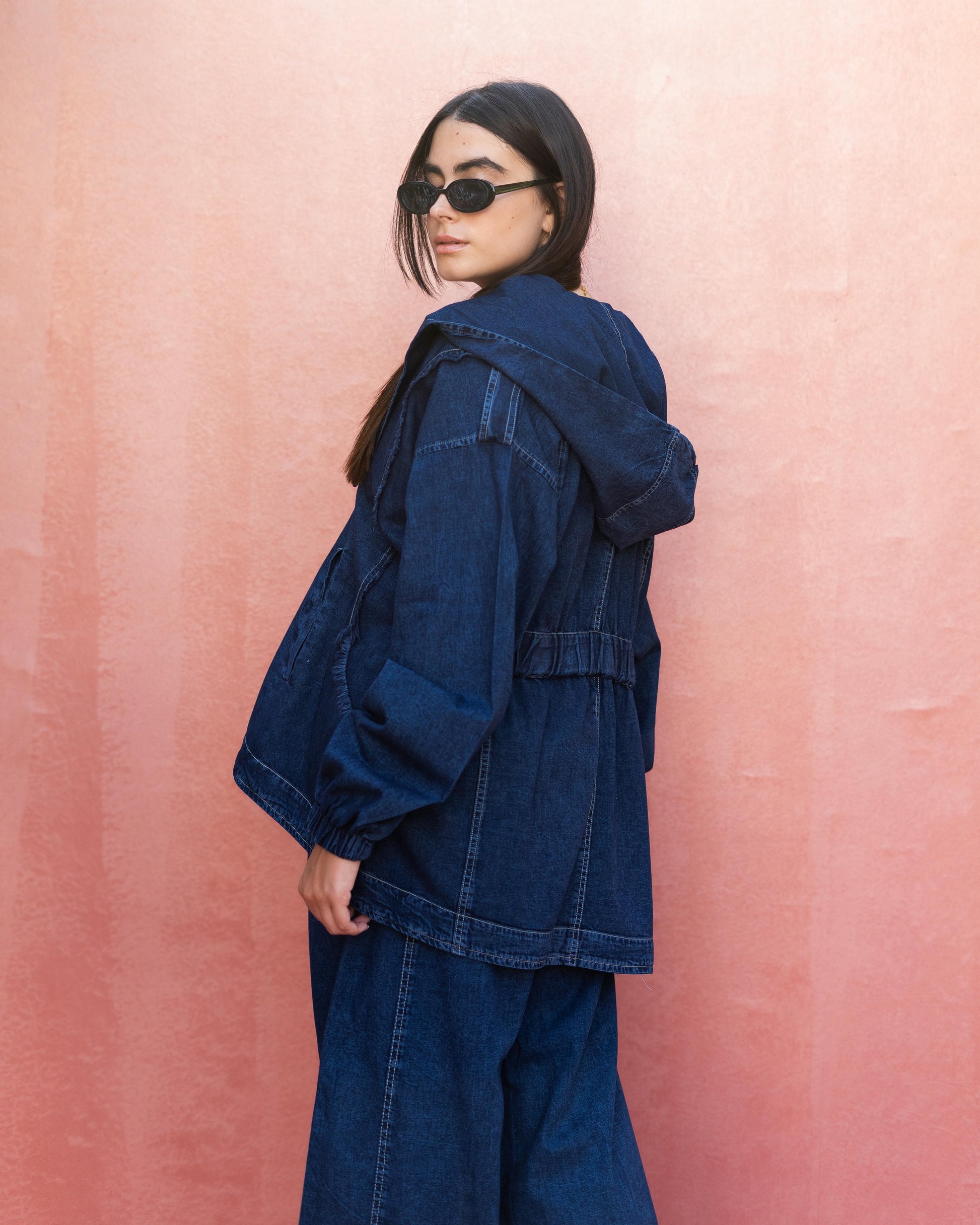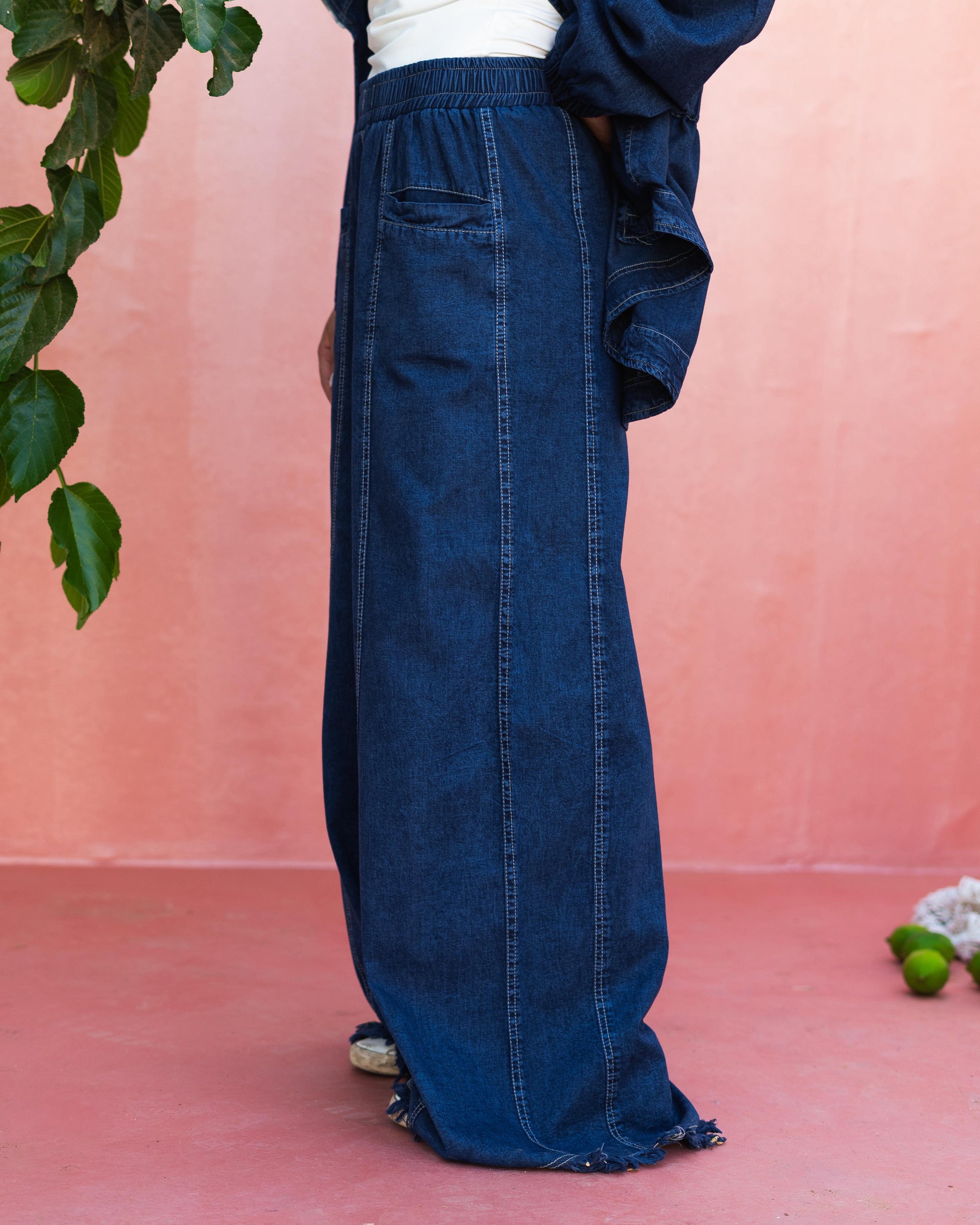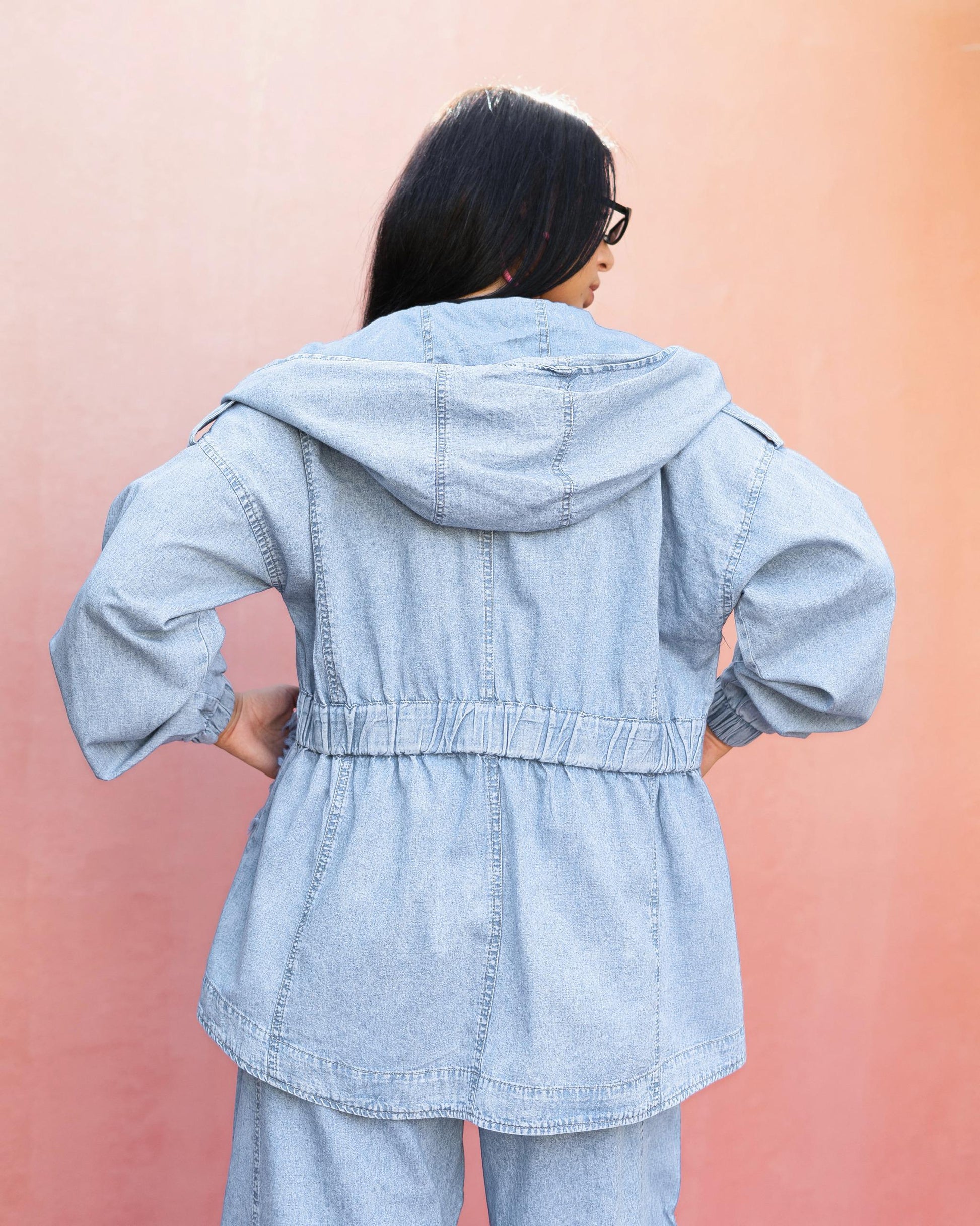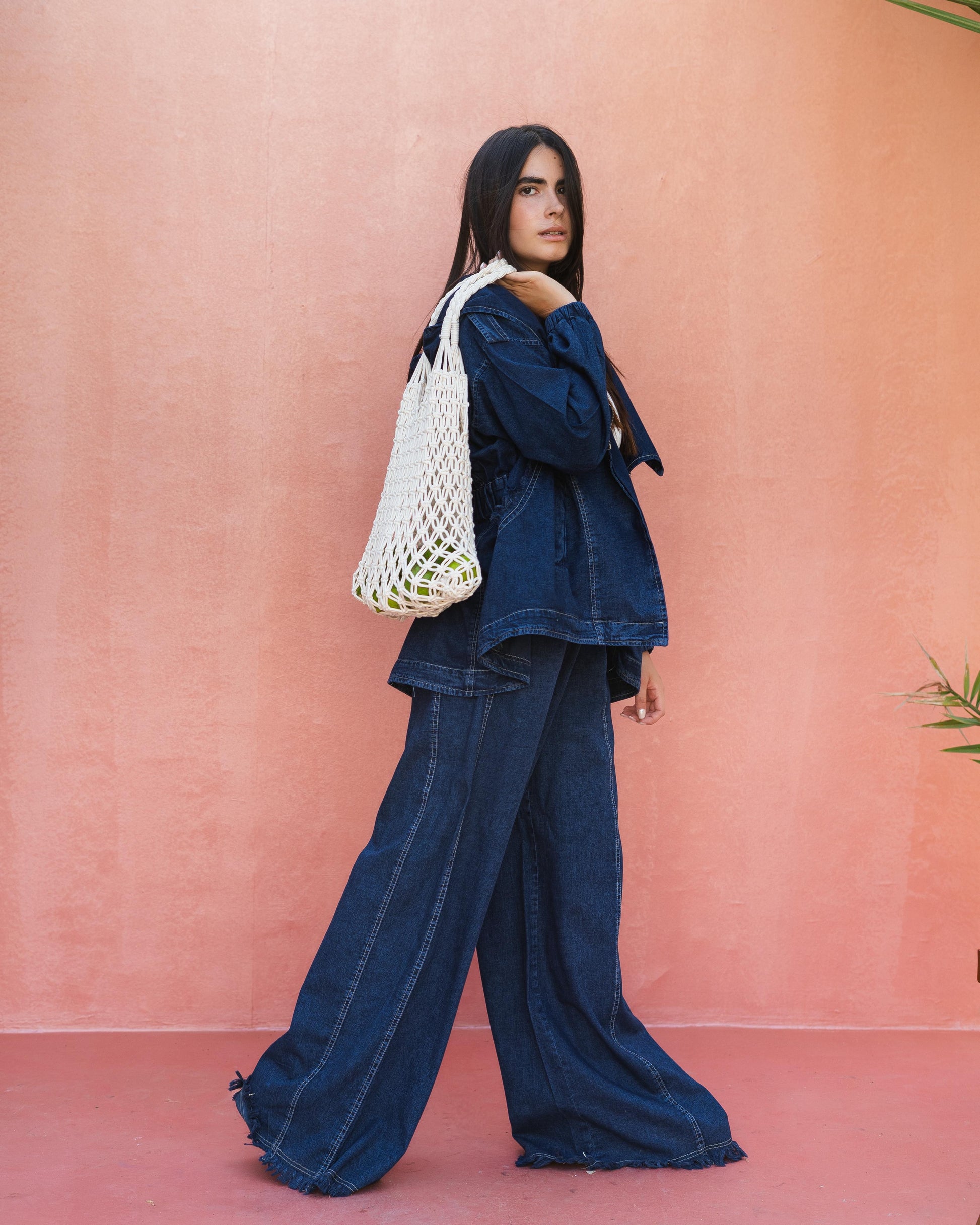 Make a bold statement with our oversized denim co-ord set, designed for effortless edge and all-day comfort. this set includes a relaxed zip-up jacket with drop shoulders and functional pockets, paired with wide-leg trousers.