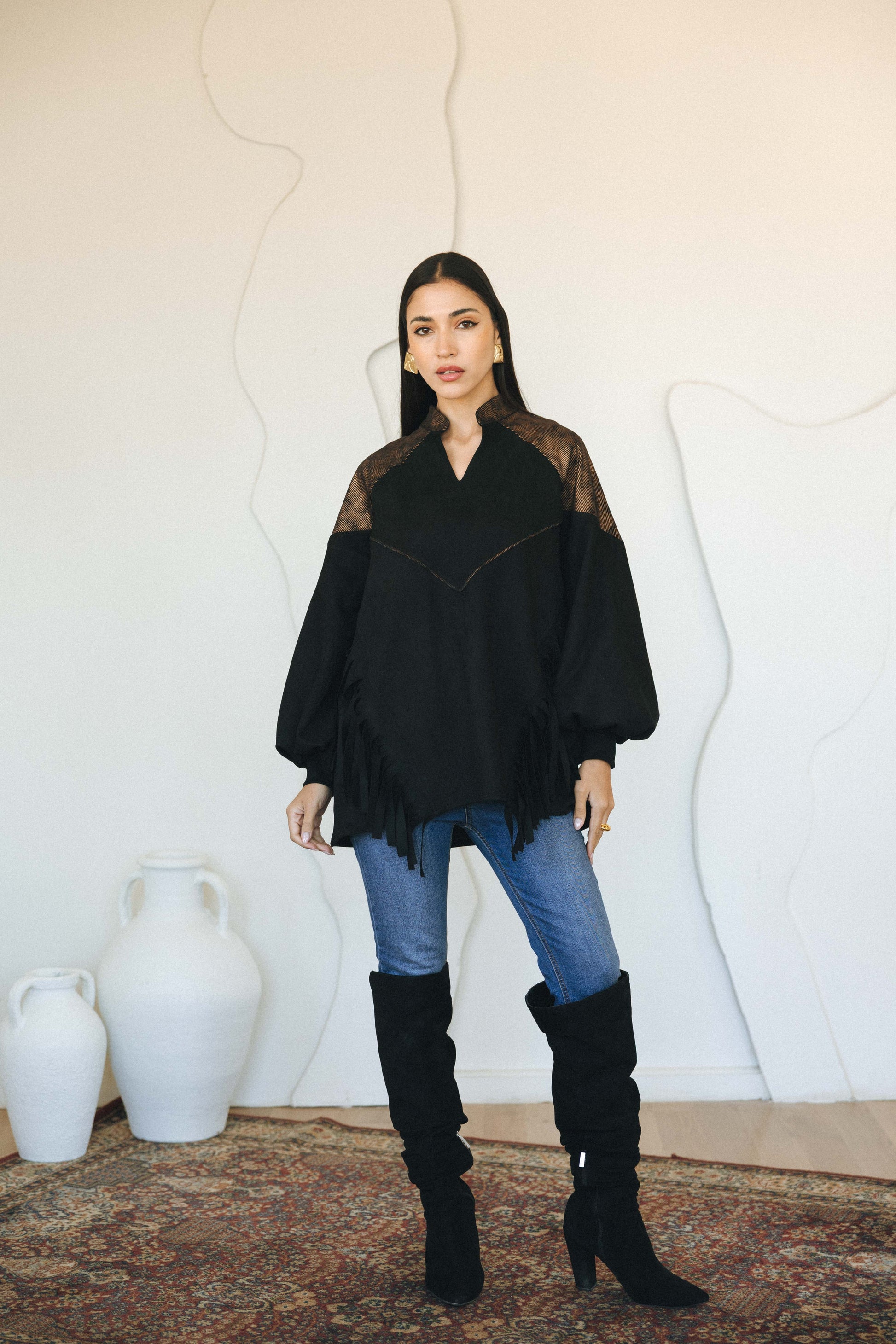 A soft suede top detailed with delicate fringes that move effortlessly with every step. Designed to add texture and quiet statement to any look.