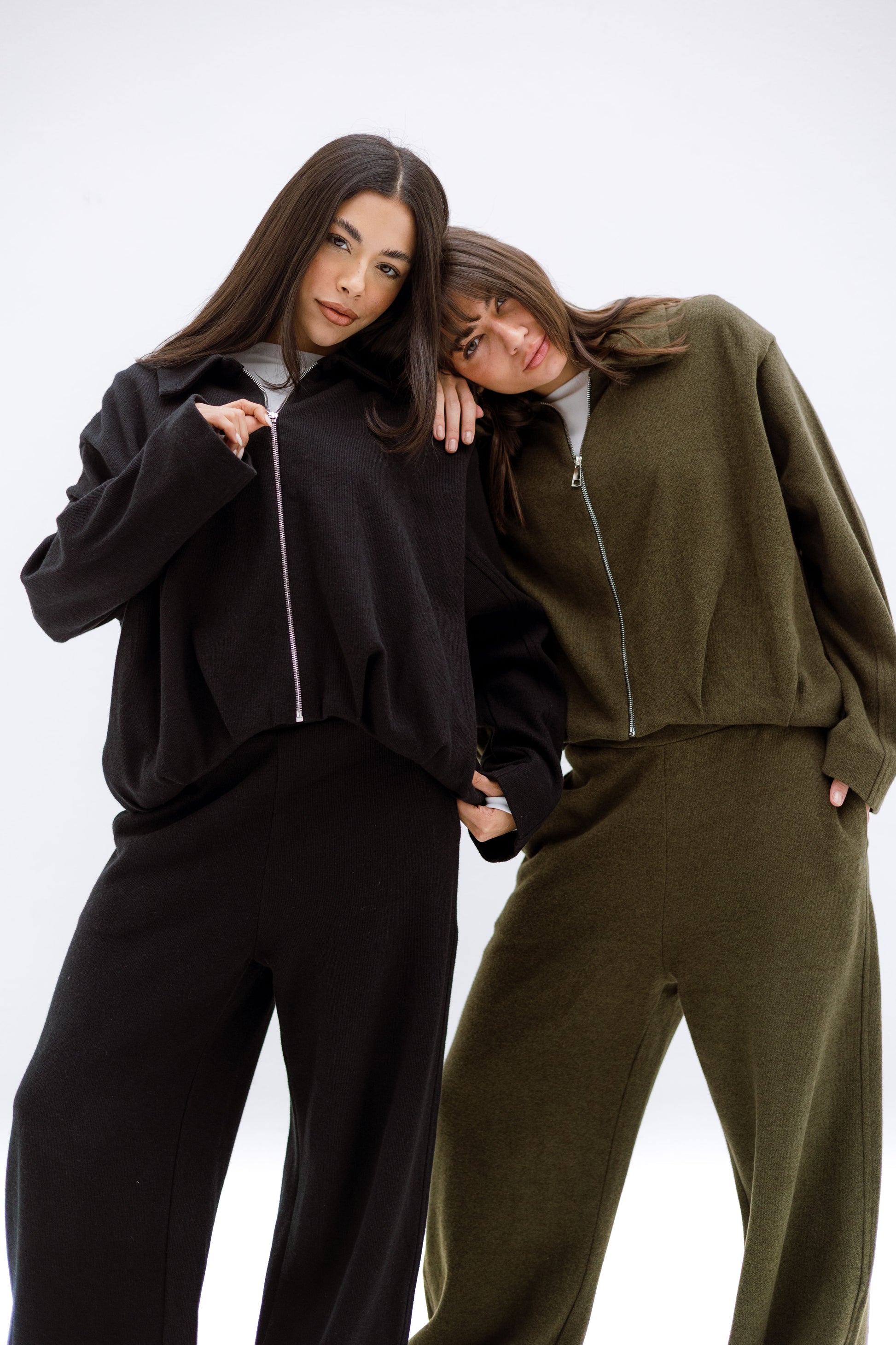 A soft, relaxed two-piece set featuring a zip-front top with a structured collar and wide-leg pants