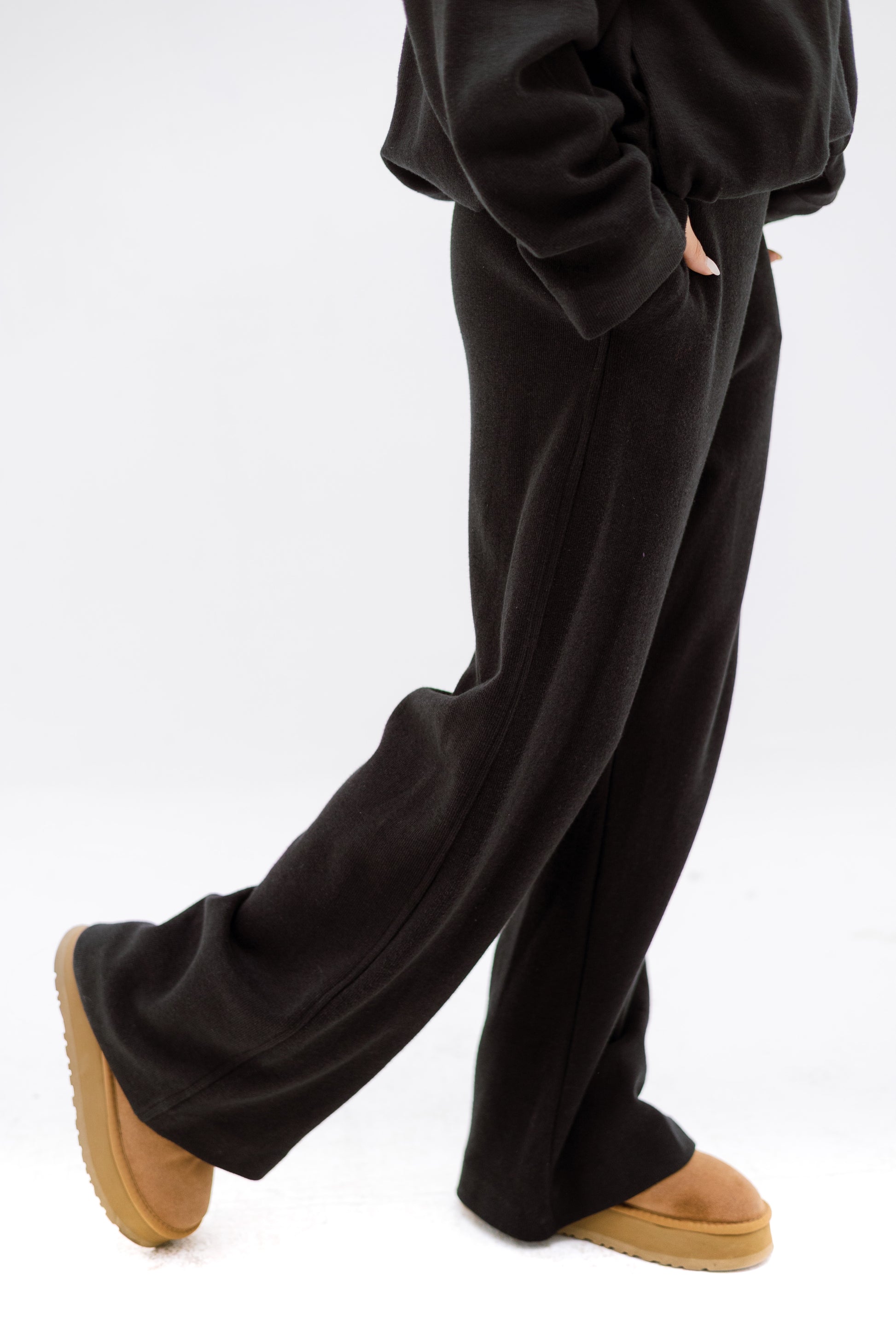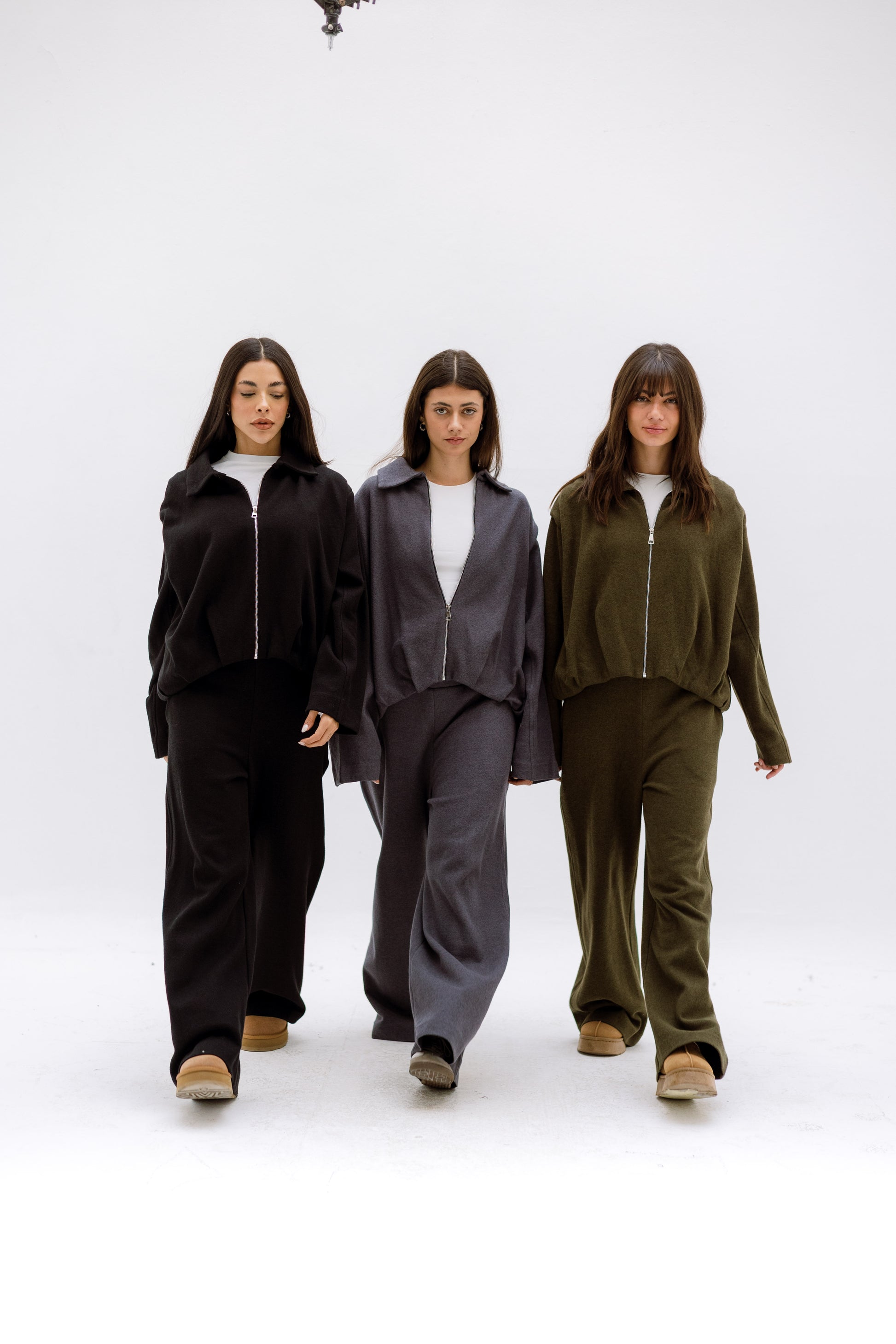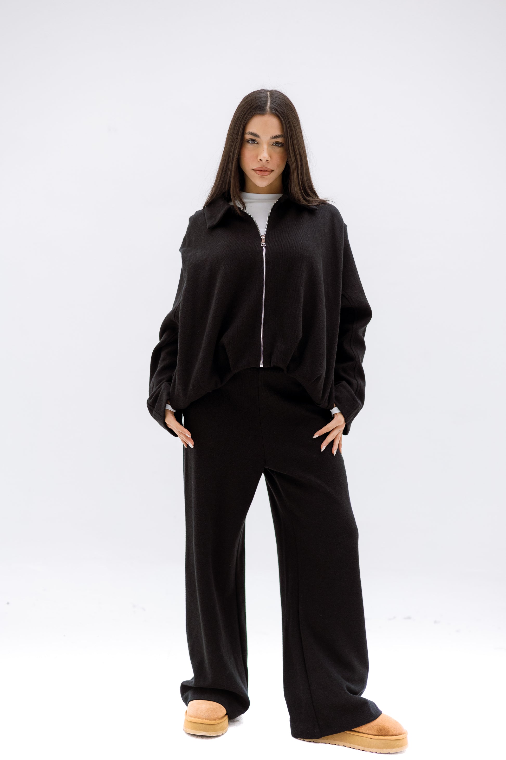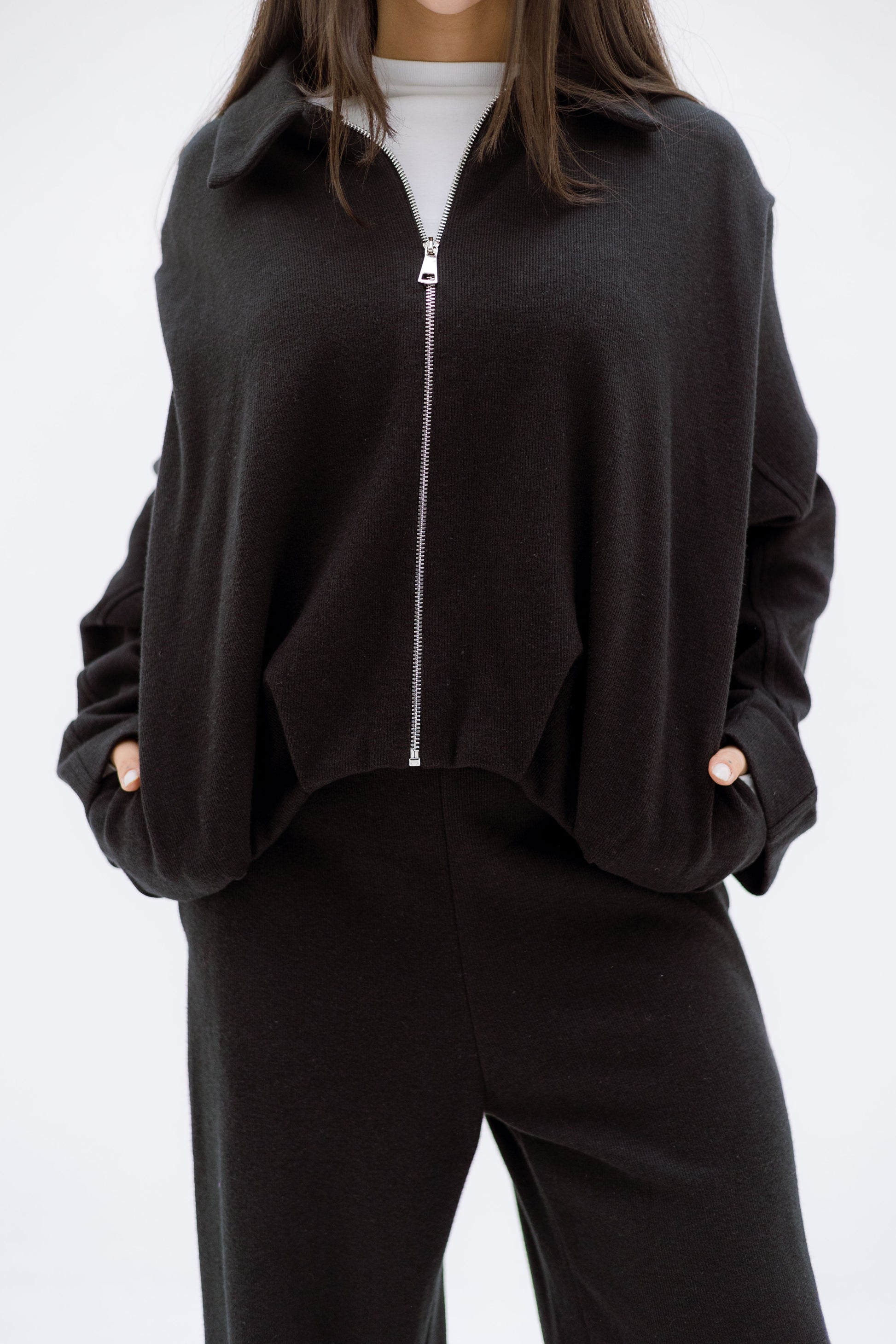A soft, relaxed two-piece set featuring a zip-front top with a structured collar and wide-leg pants for effortless, everyday comfort. Perfect for cozy, minimal styling.