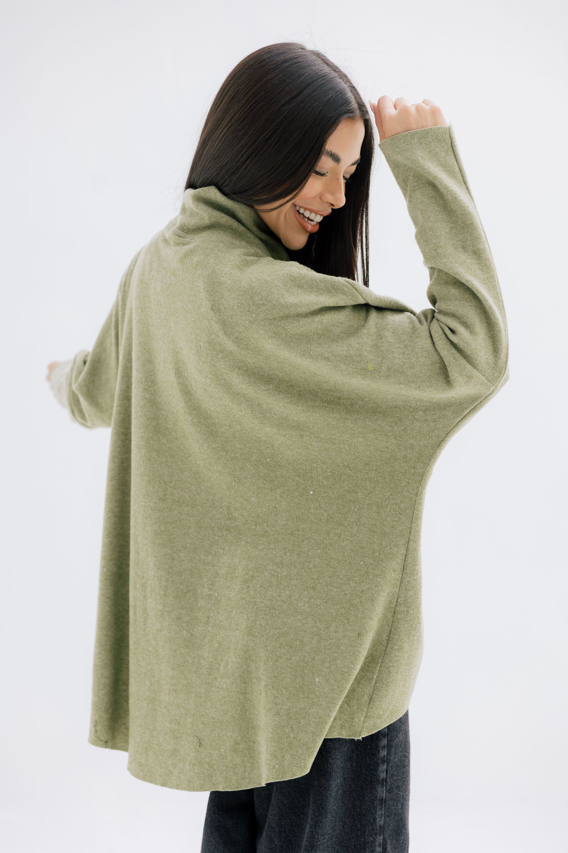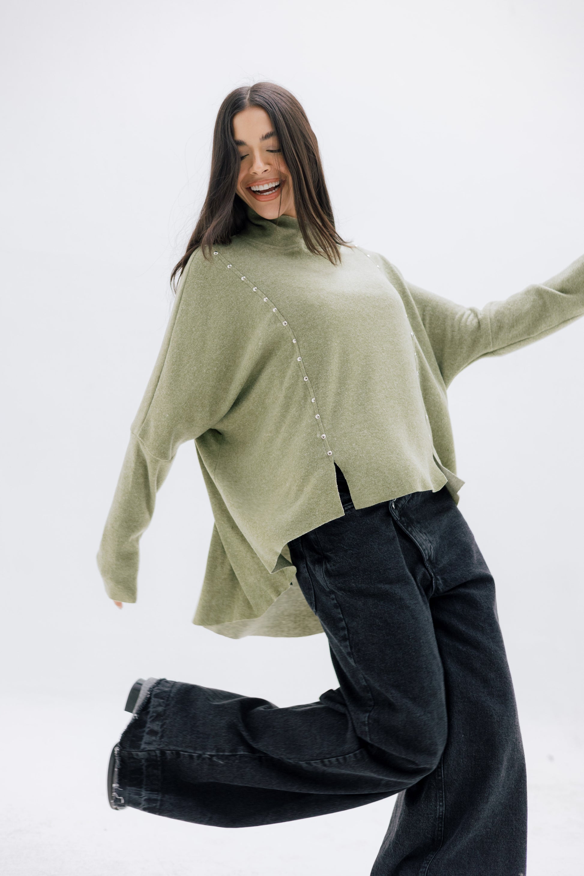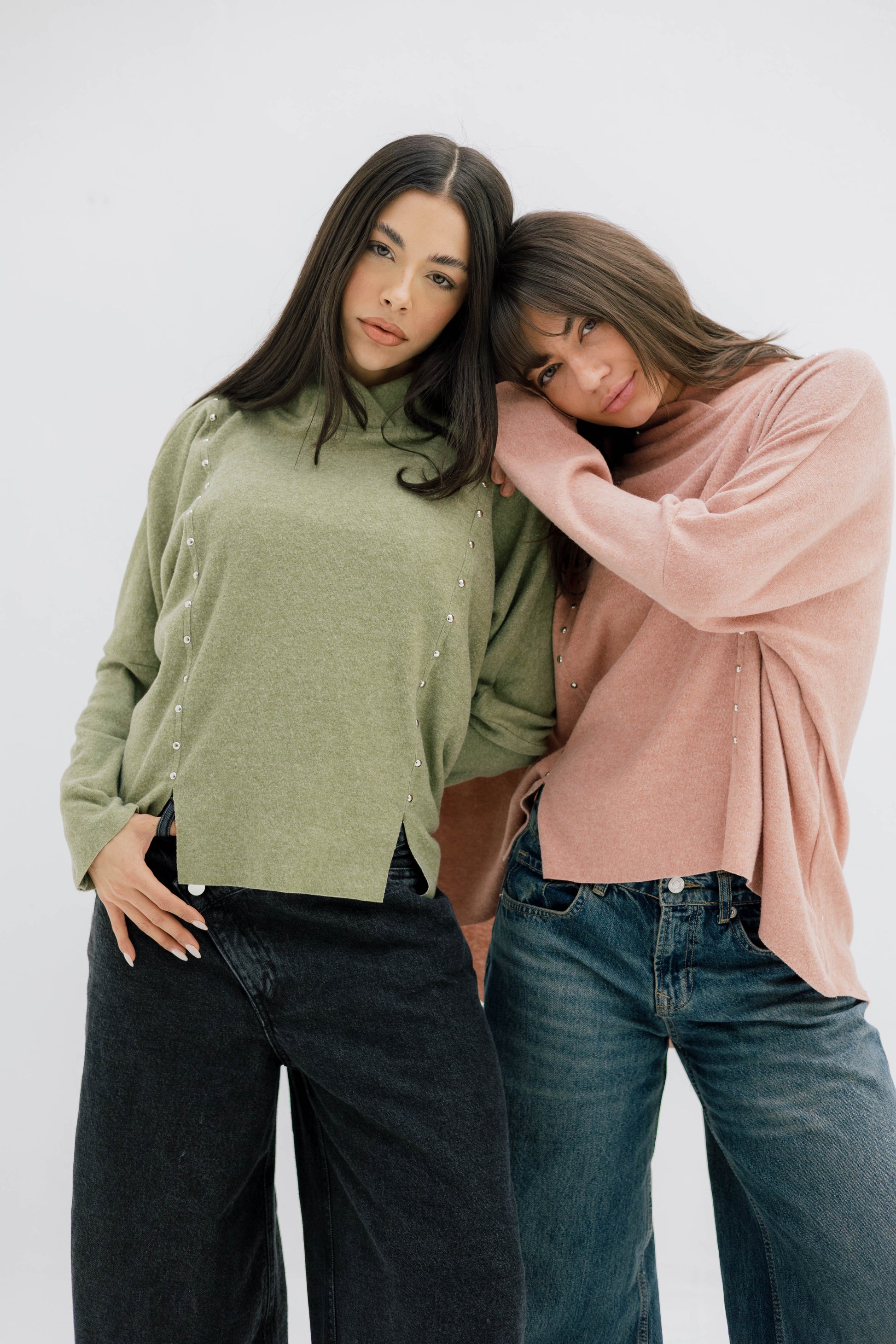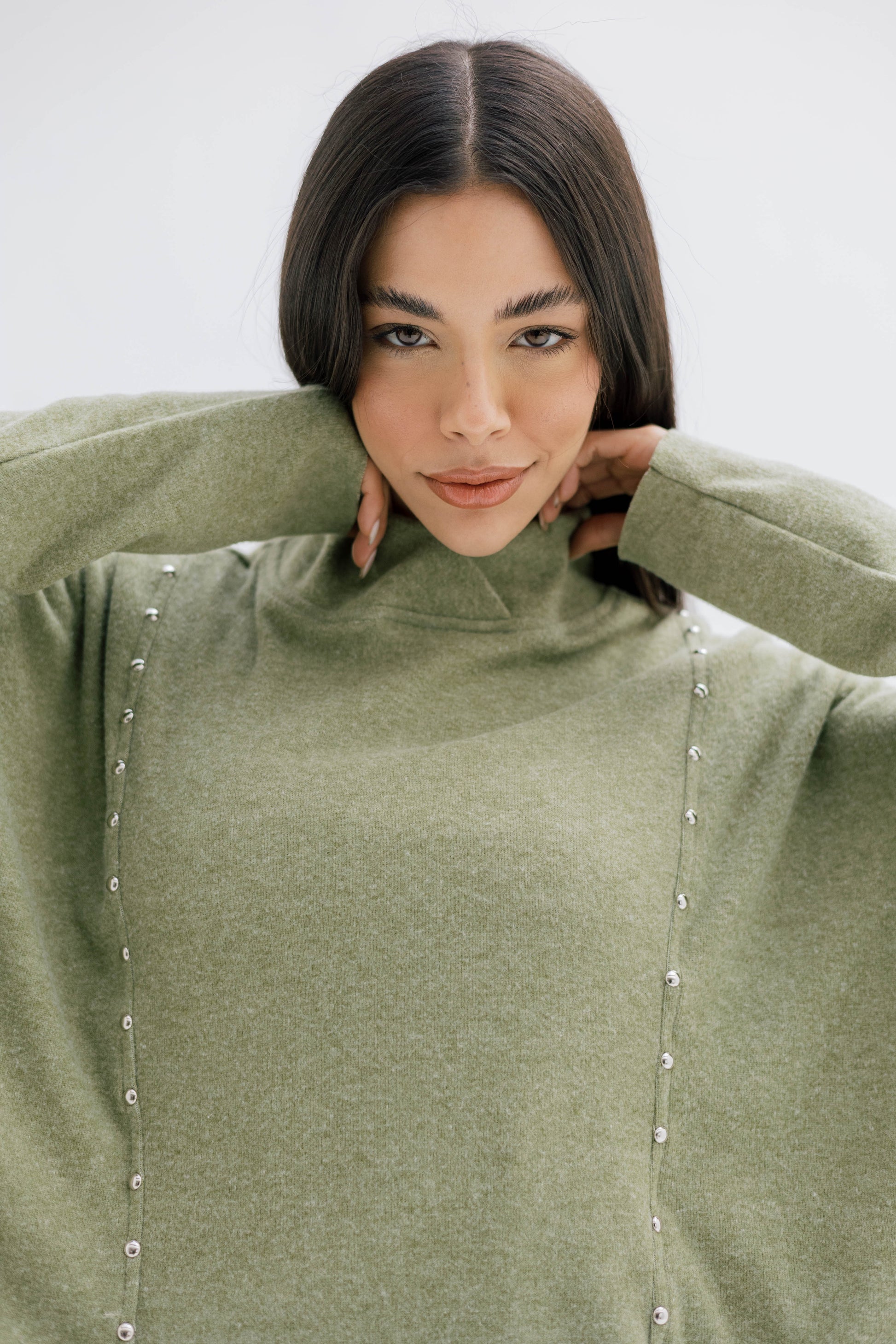A relaxed, soft-knit top featuring sleek vertical stud details and a modern high neckline. Comfortable, chic, and perfect for effortless winter styling.