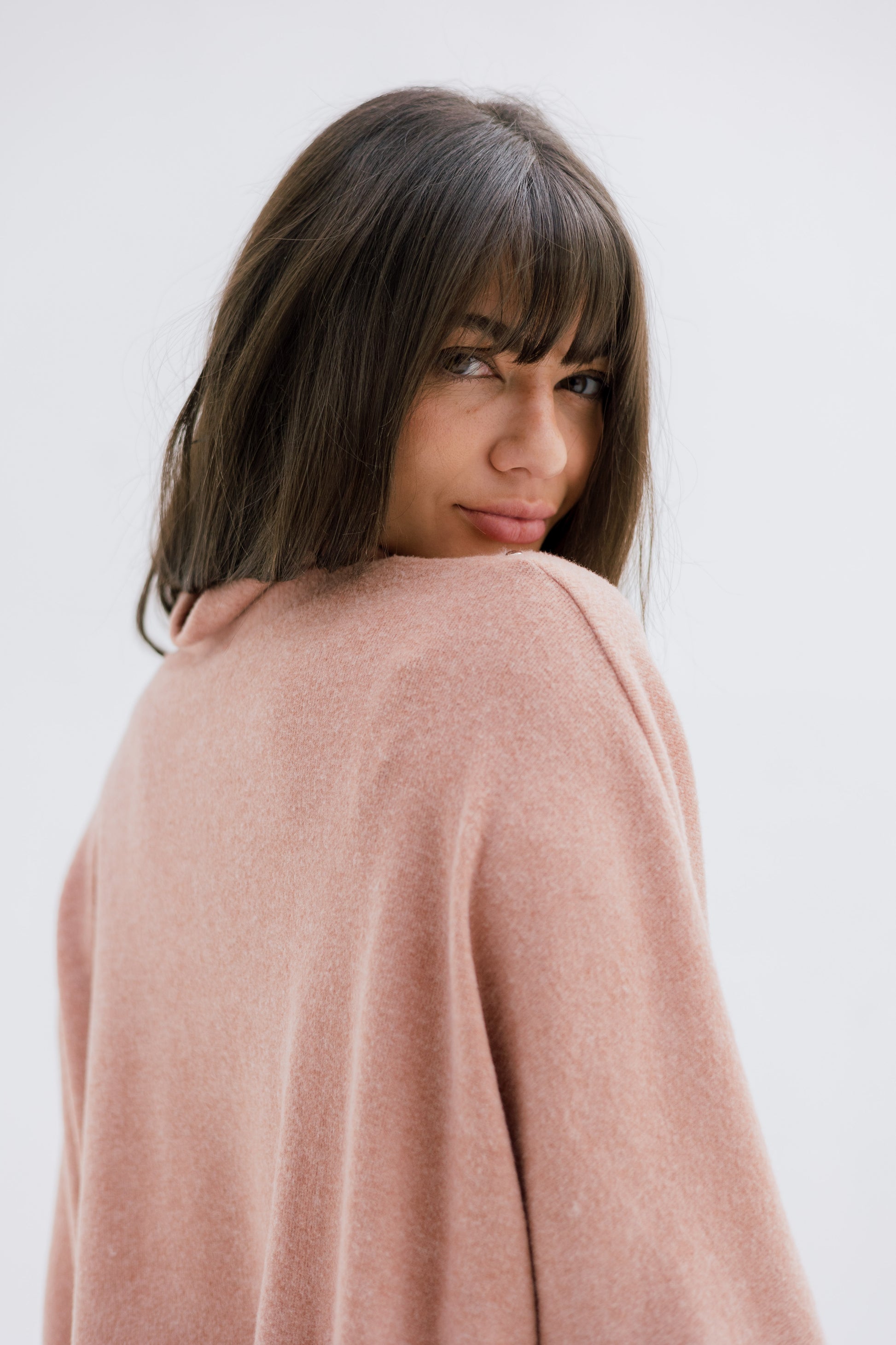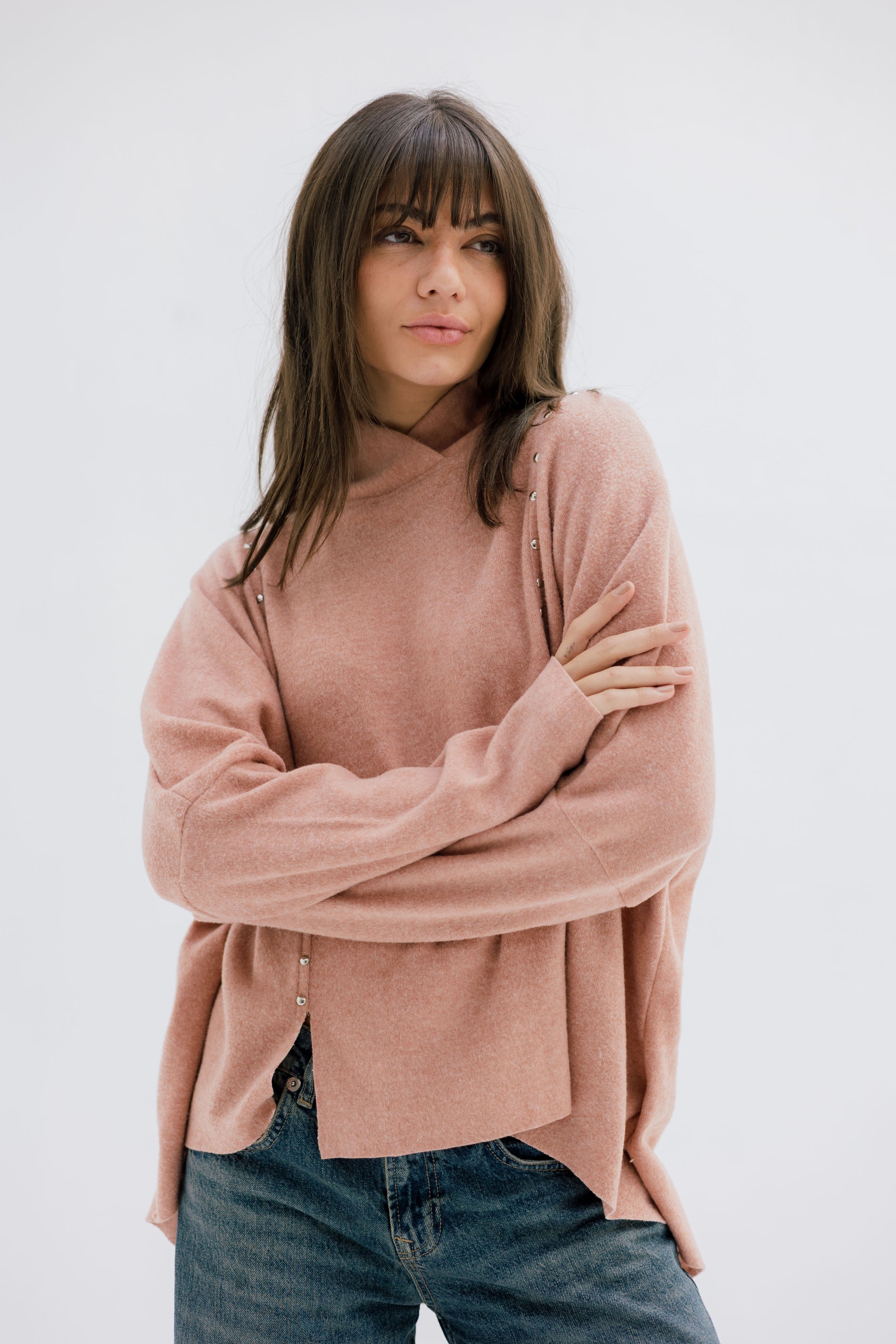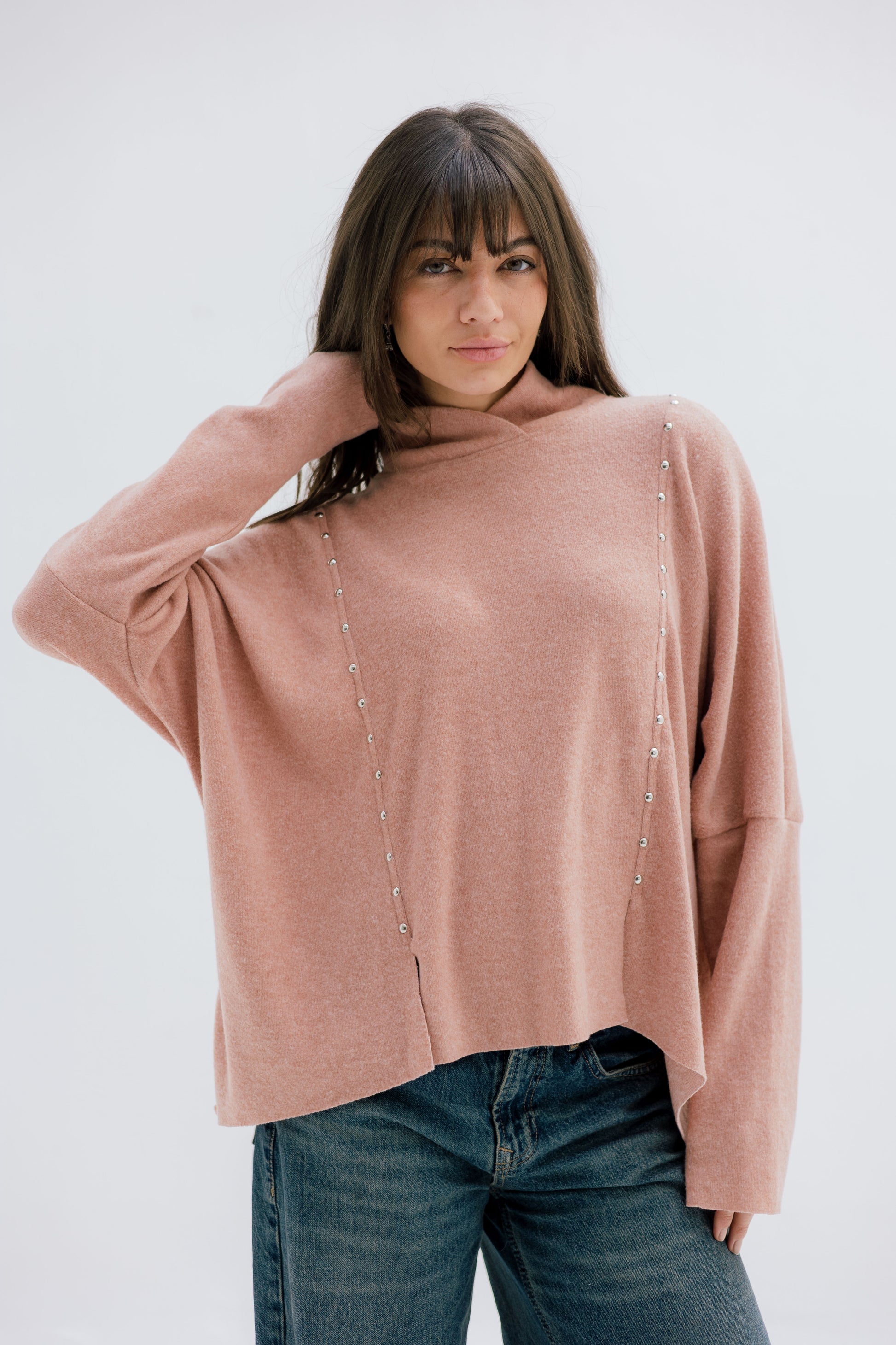 A relaxed, soft-knit top featuring sleek vertical stud details and a modern high neckline. Comfortable, chic, and perfect for effortless winter styling.
