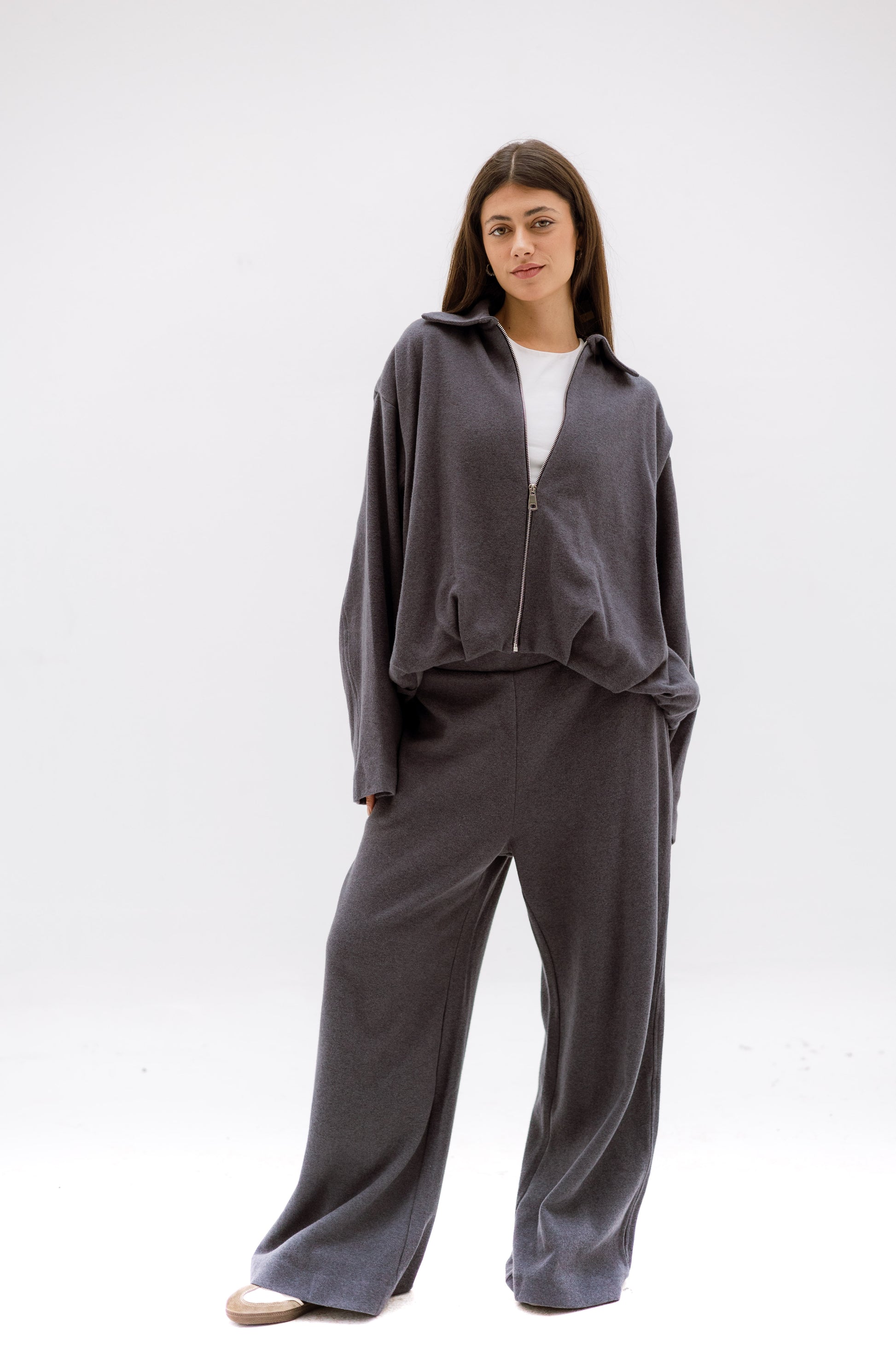 A soft, relaxed two-piece set featuring a zip-front top with a structured collar and wide-leg pants