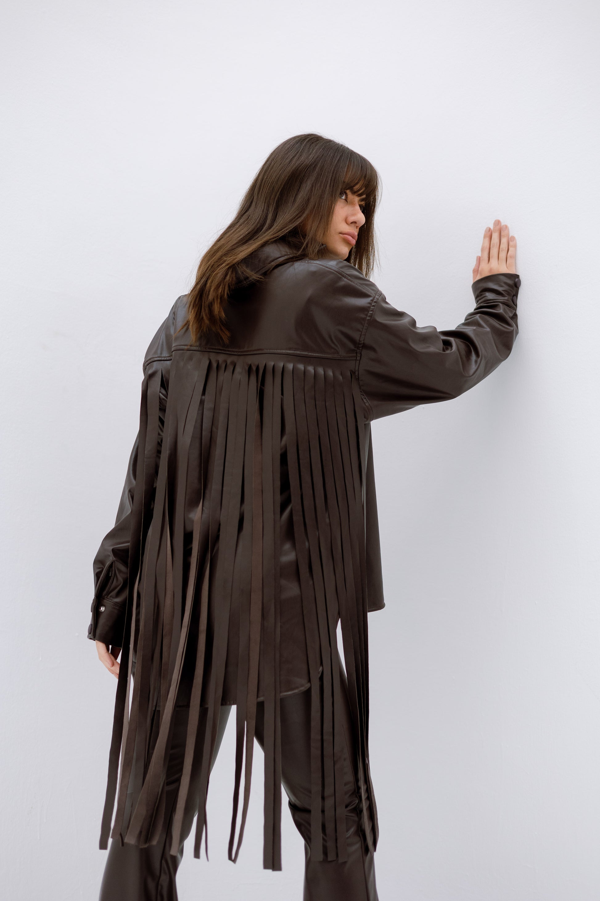 A bold faux-leather fringe set, fully lined with soft fleece on the inside for extra warmth and comfort. The dramatic fringe top and matching flared pants create an edgy, high-fashion look with a cozy feel.
