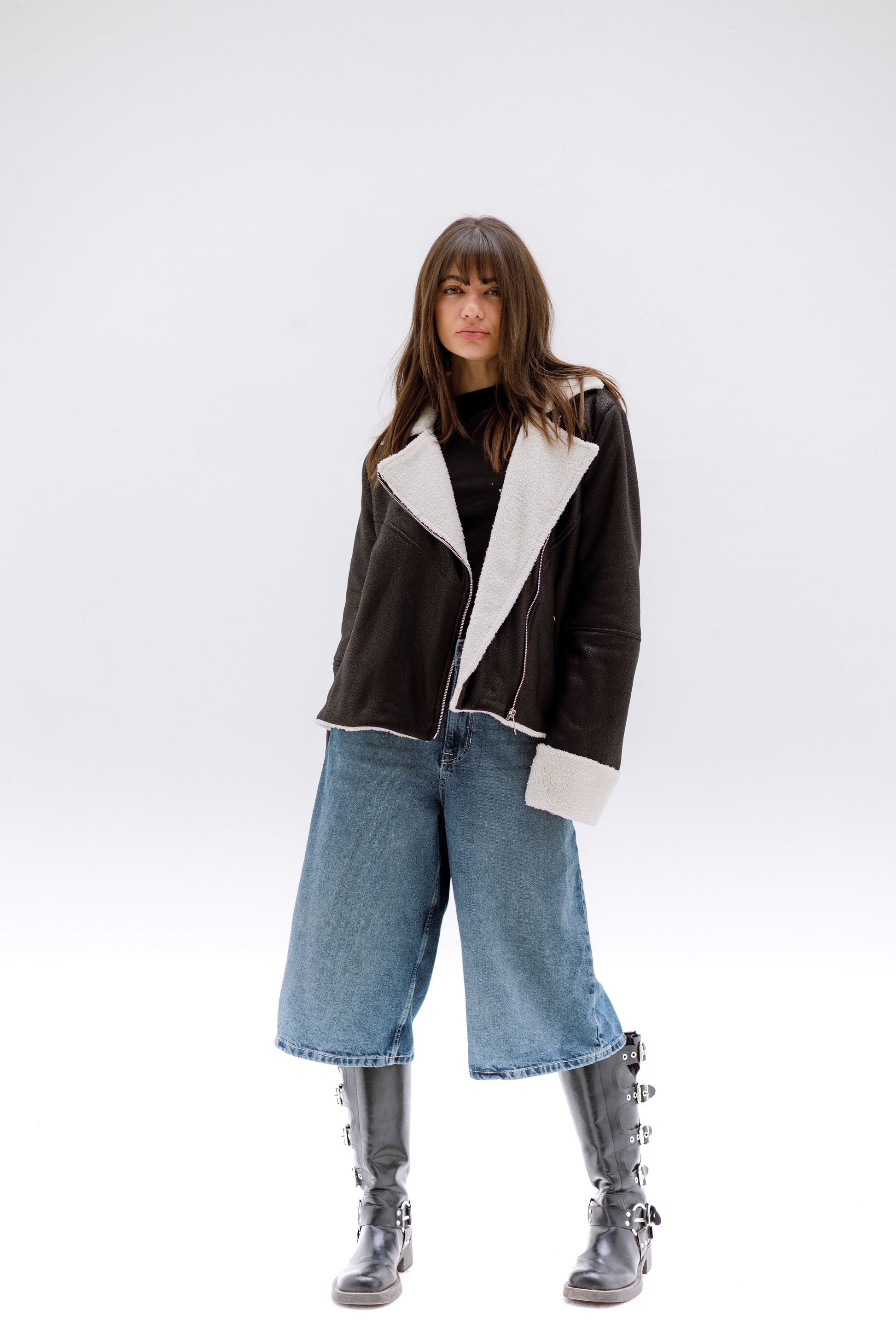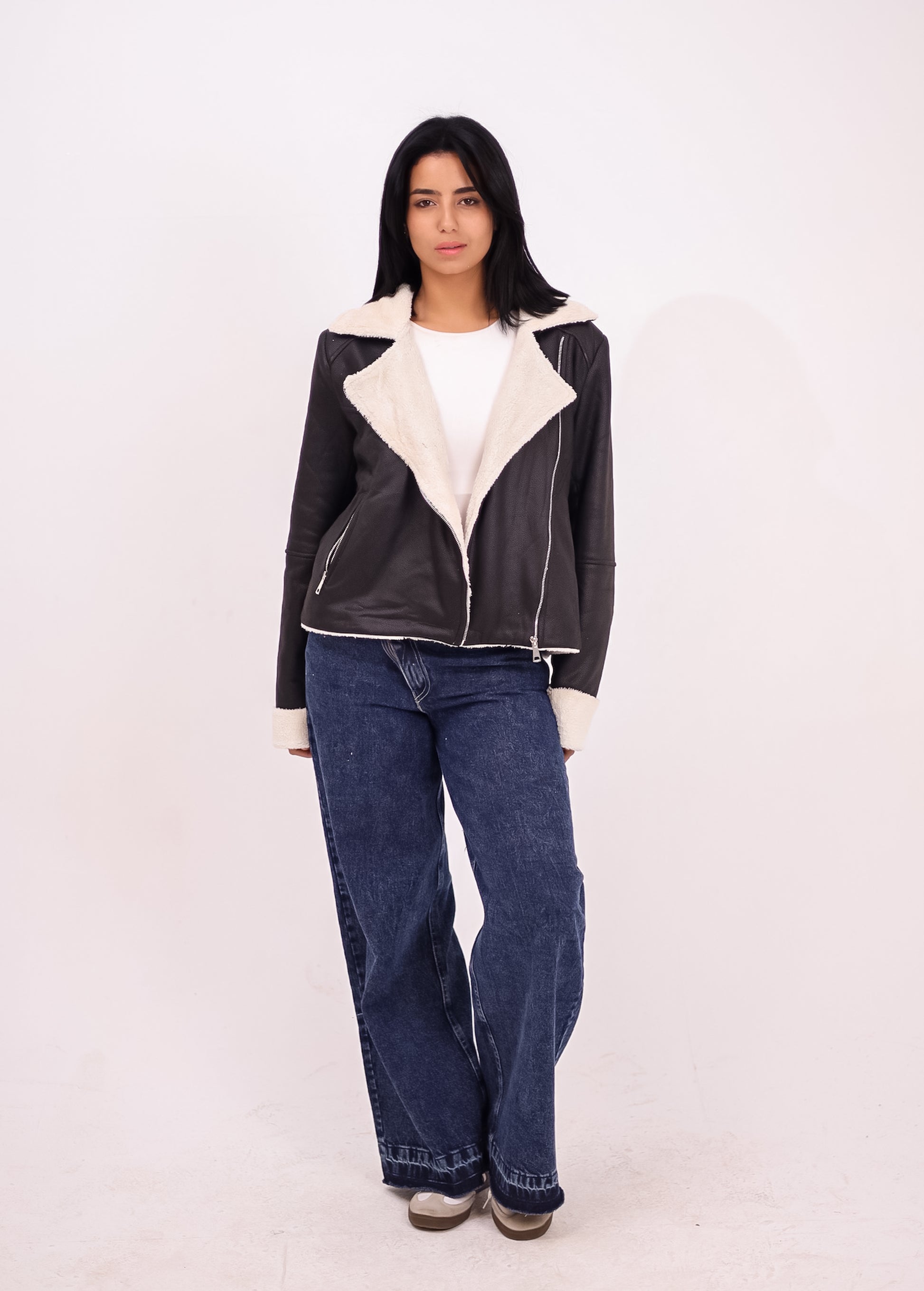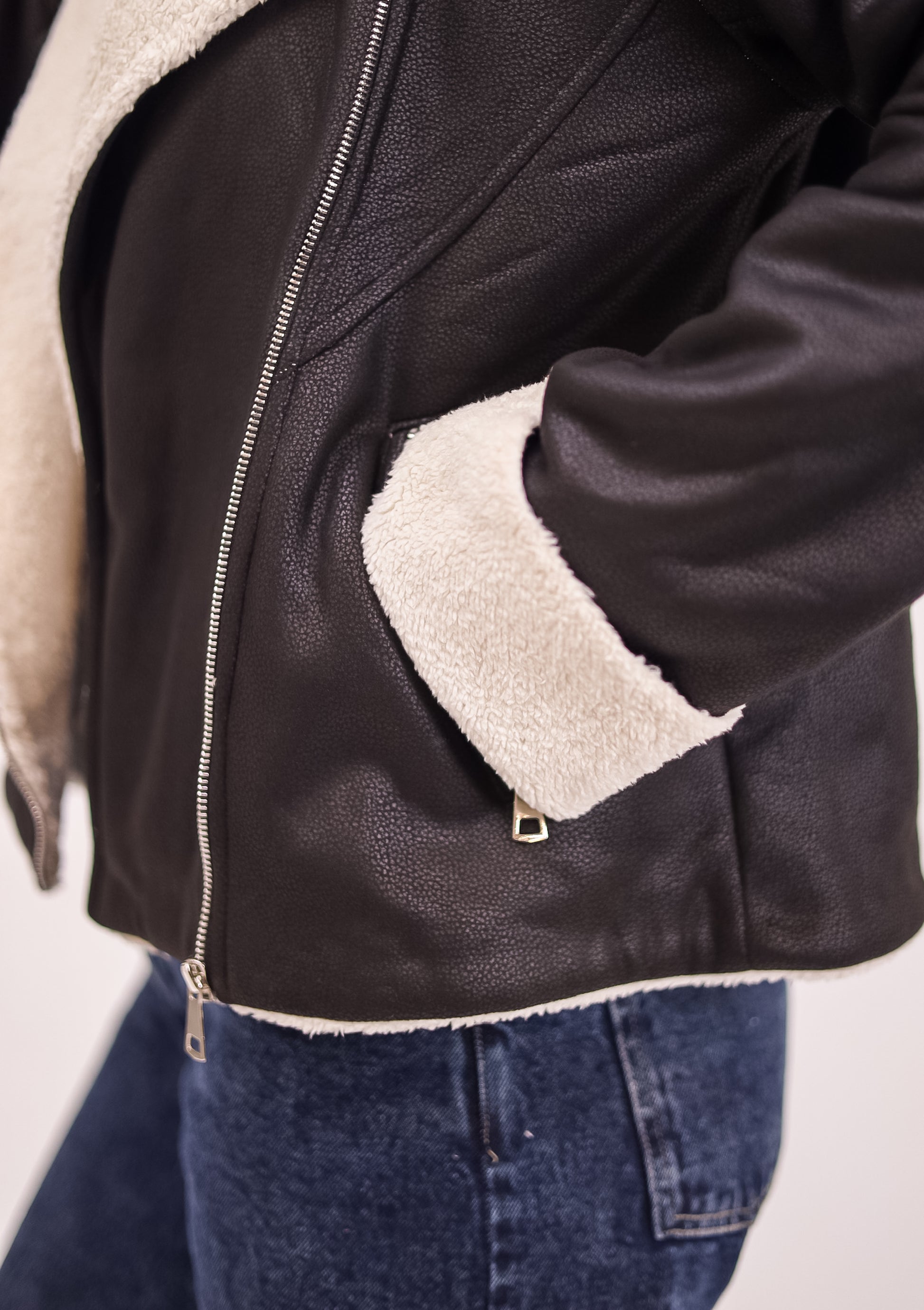 A faux leather jacket fully lined with plush teddy fur for maximum warmth and comfort. Designed with a clean zip front and a cozy fold-over collar, it blends the edgy look of leather with the soft, snug feel of teddy — the perfect everyday winter layer.