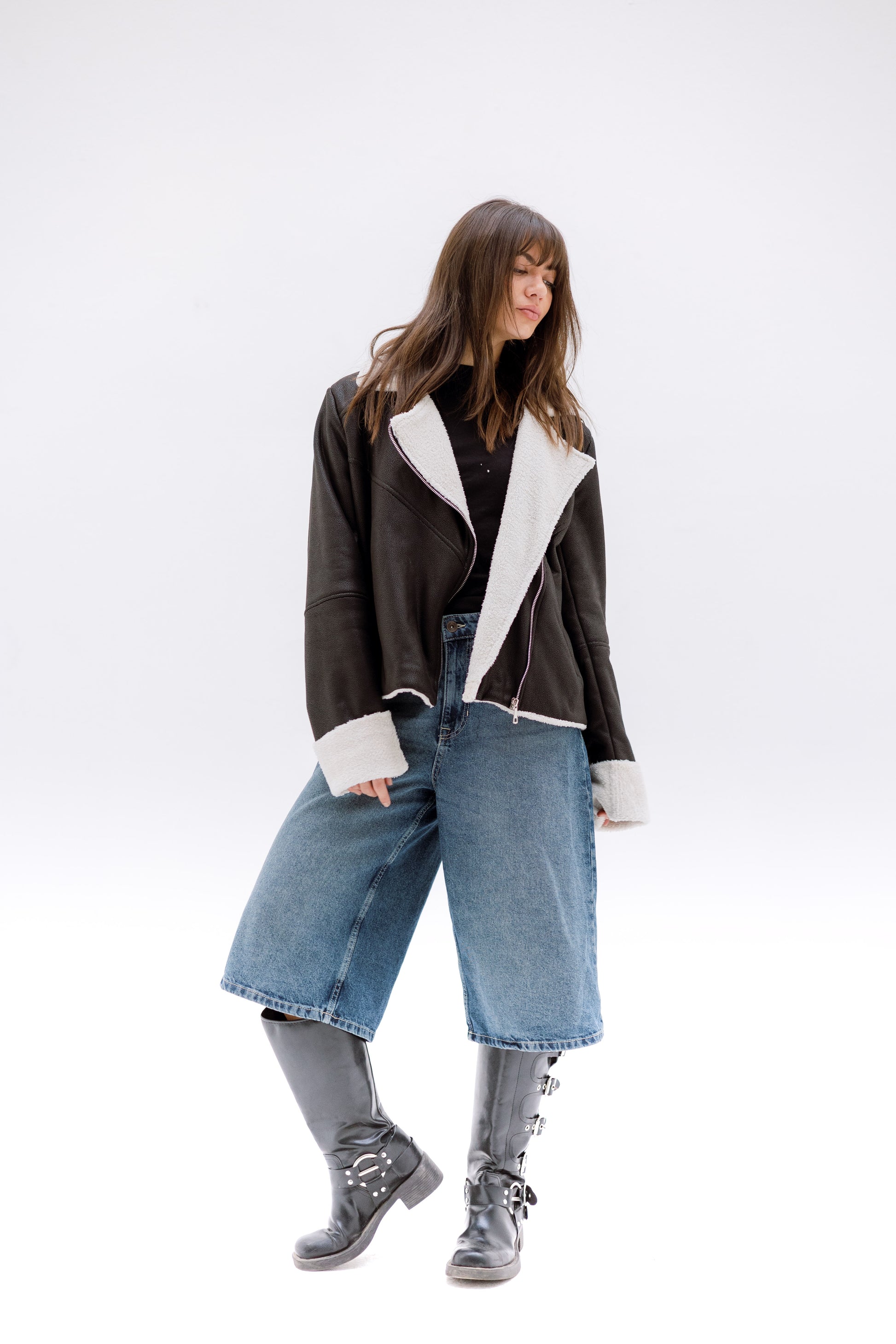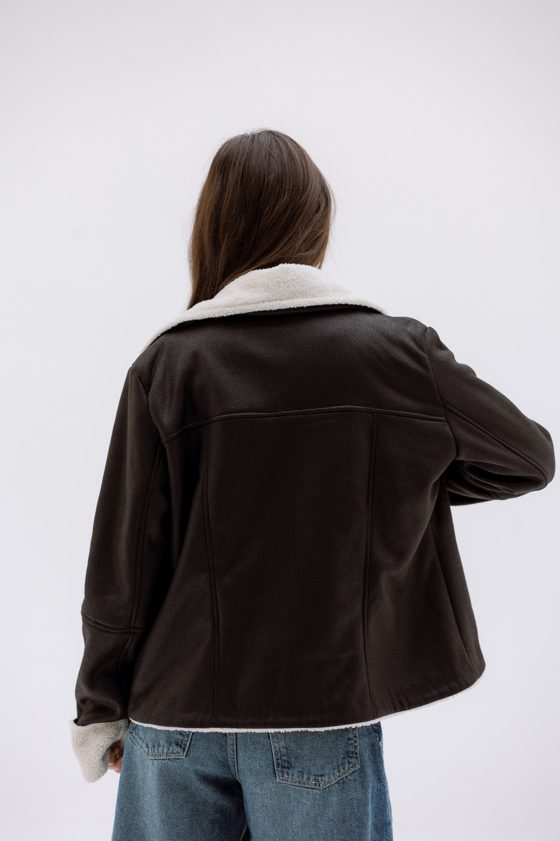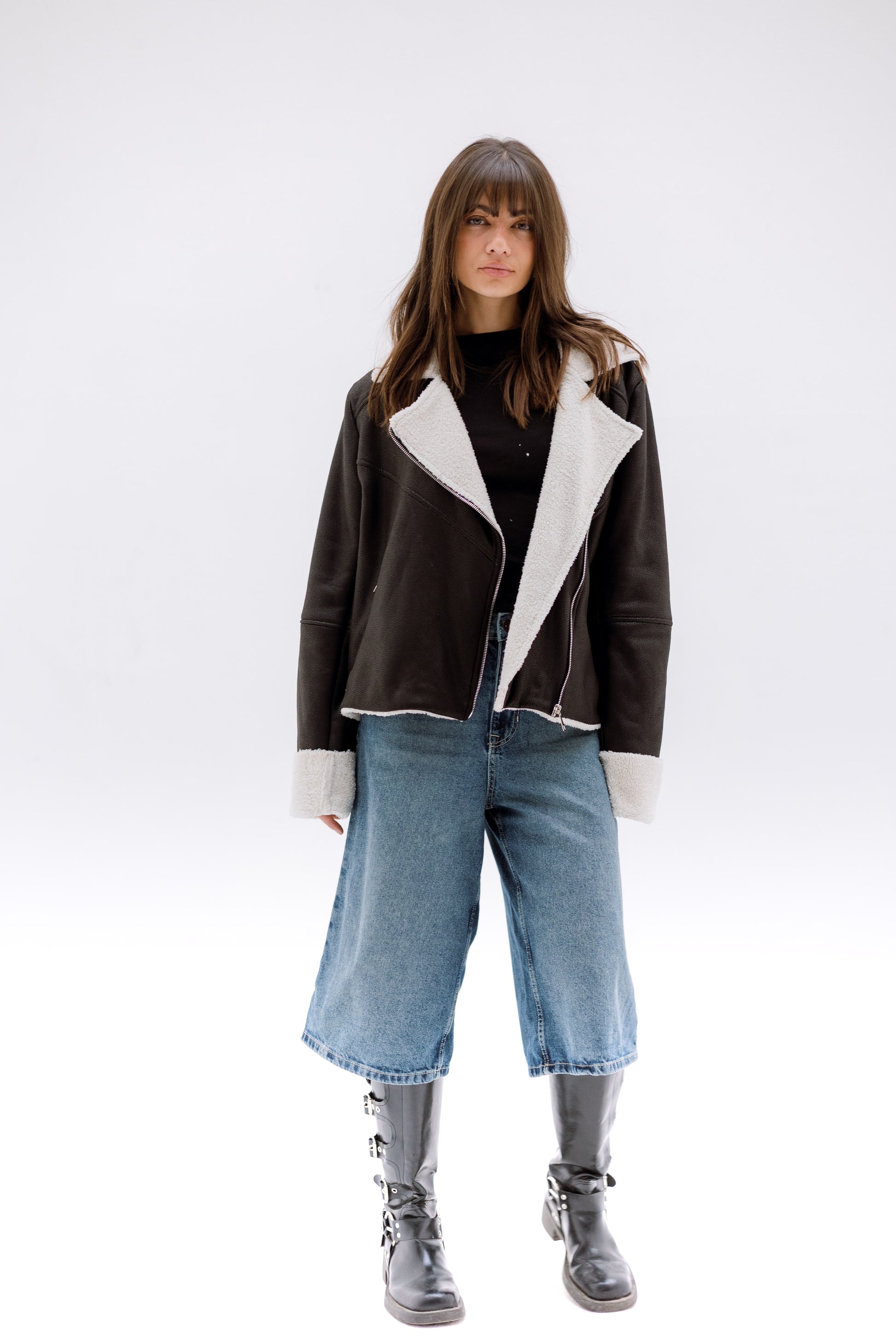 A faux leather jacket fully lined with plush teddy fur for maximum warmth and comfort. Designed with a clean zip front and a cozy fold-over collar, it blends the edgy look of leather with the soft, snug feel of teddy — the perfect everyday winter layer.