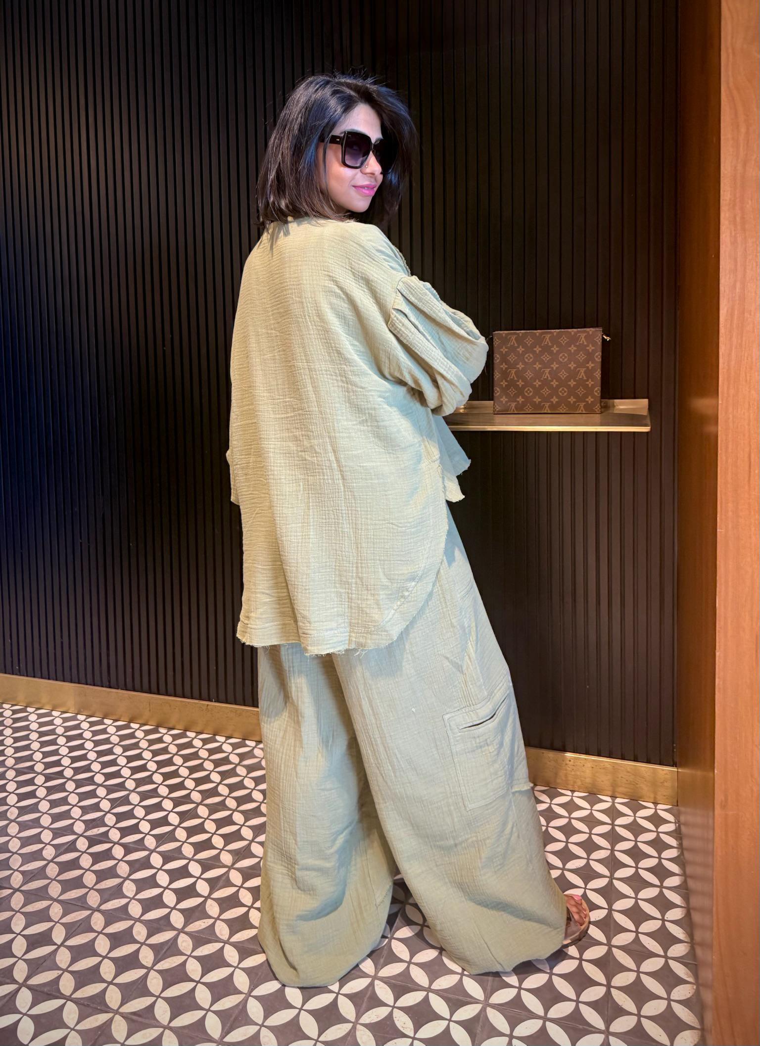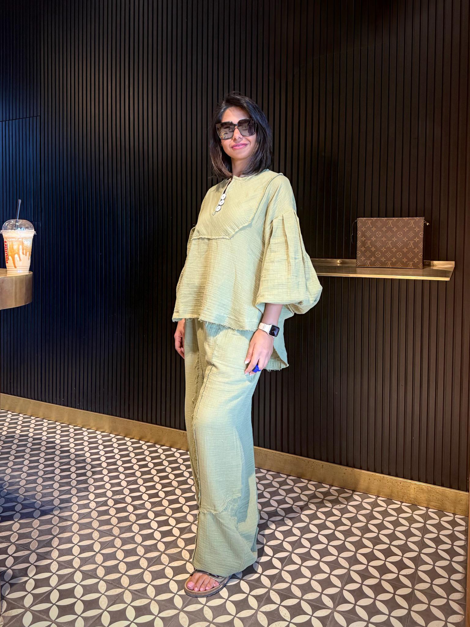 The outfit in the image features a relaxed and elegant co-Ord set, ideal for a chic casual or resort-style look.