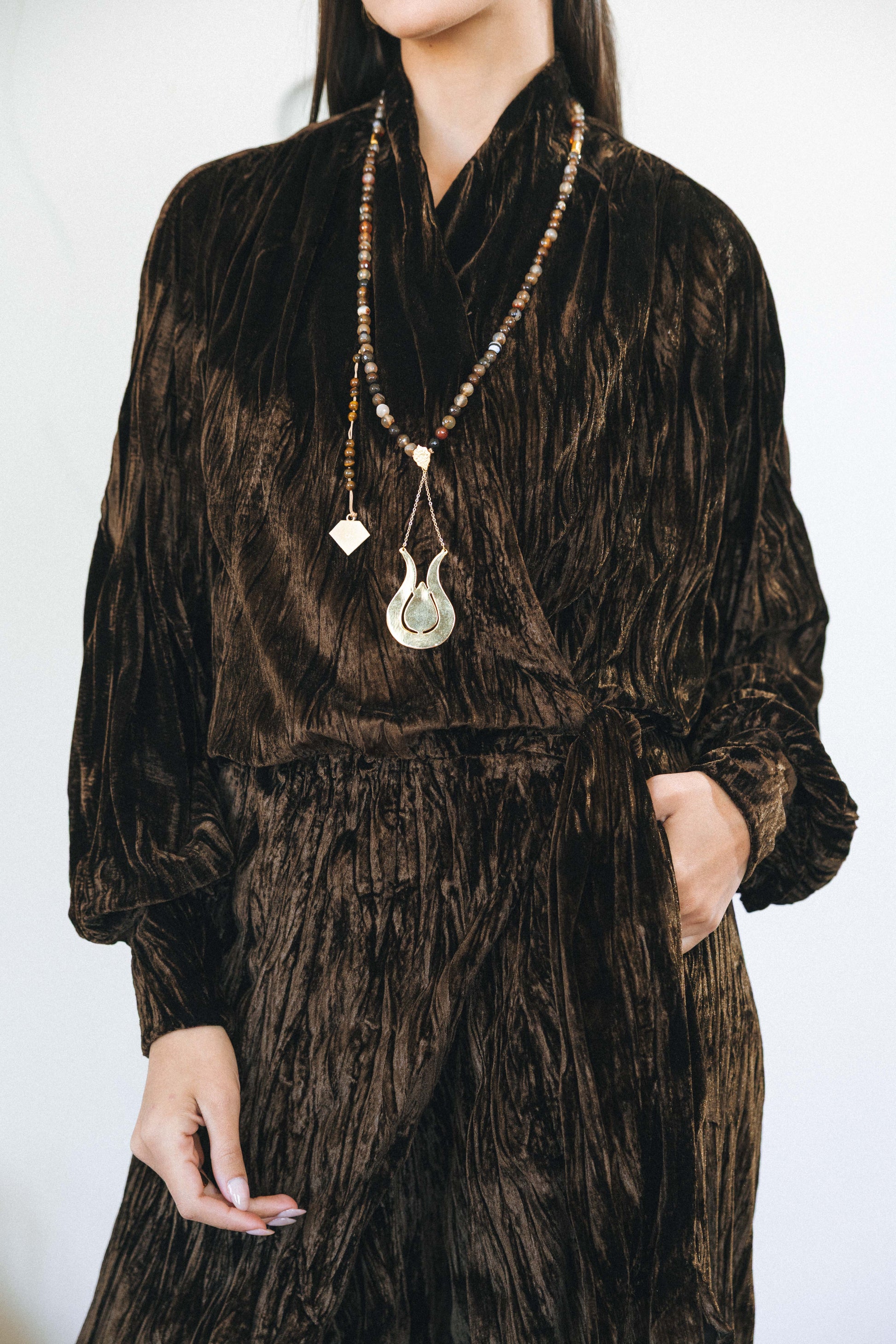 A statement velvet jumpsuit features a relaxed silhouette with pleated texture, voluminous sleeves, and wide-leg trousers that move effortlessly. Designed for understated luxury, it blends comfort with refined elegance — perfect for evenings, gatherings, and elevated daywear.