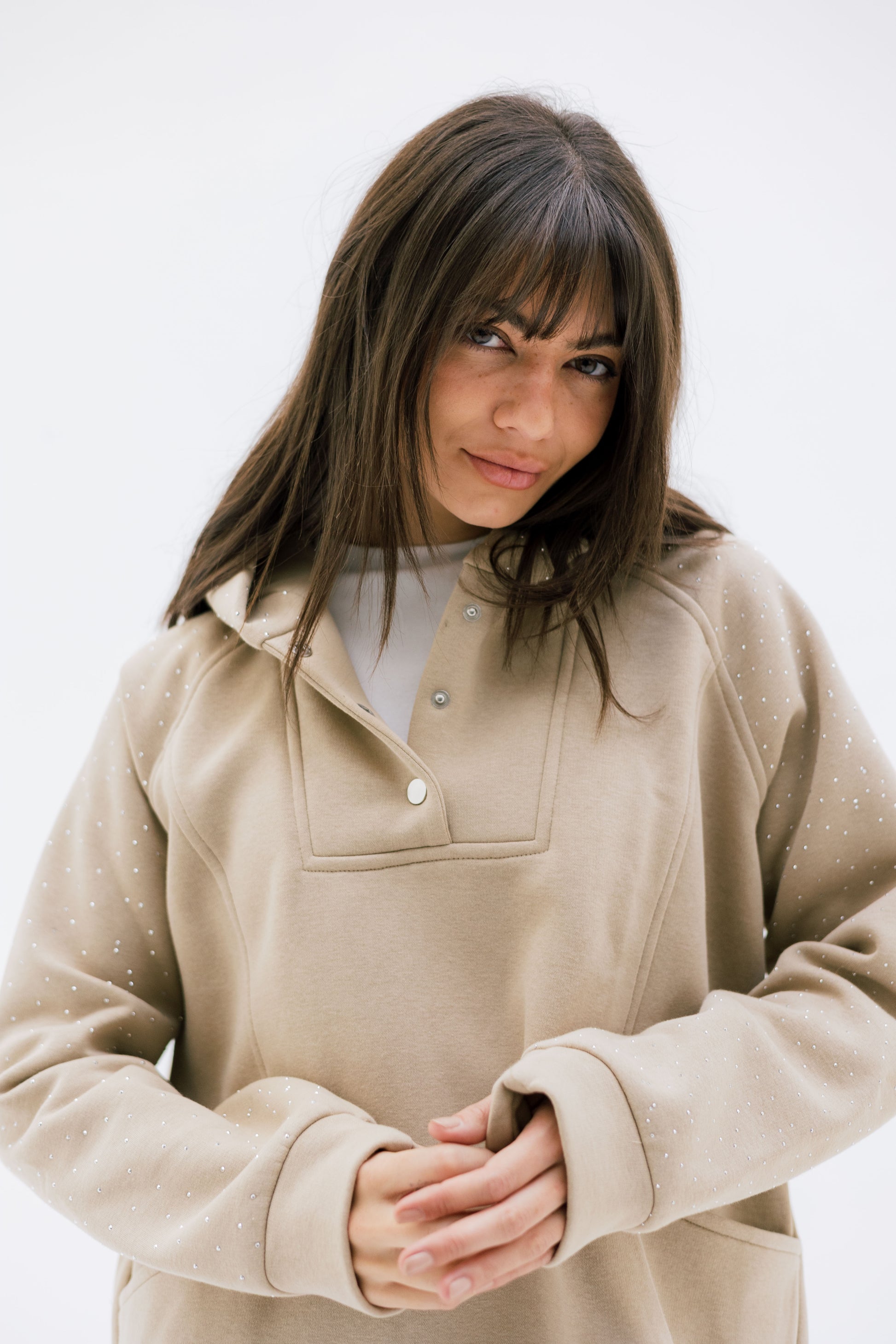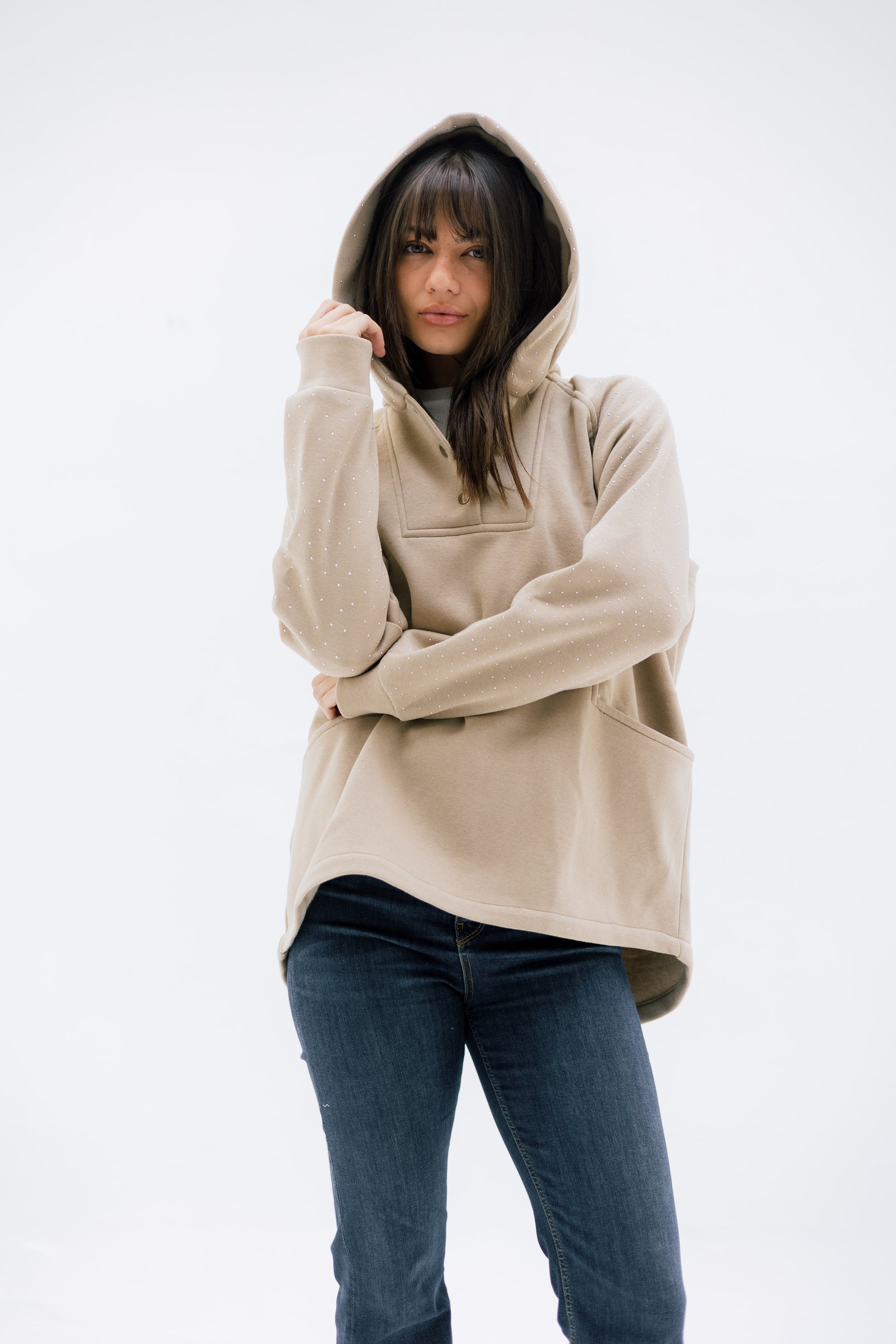 Softly embellished with delicate rhinestones, this hoodie offers a refined take on everyday luxury subtle shine, timeless comfort.