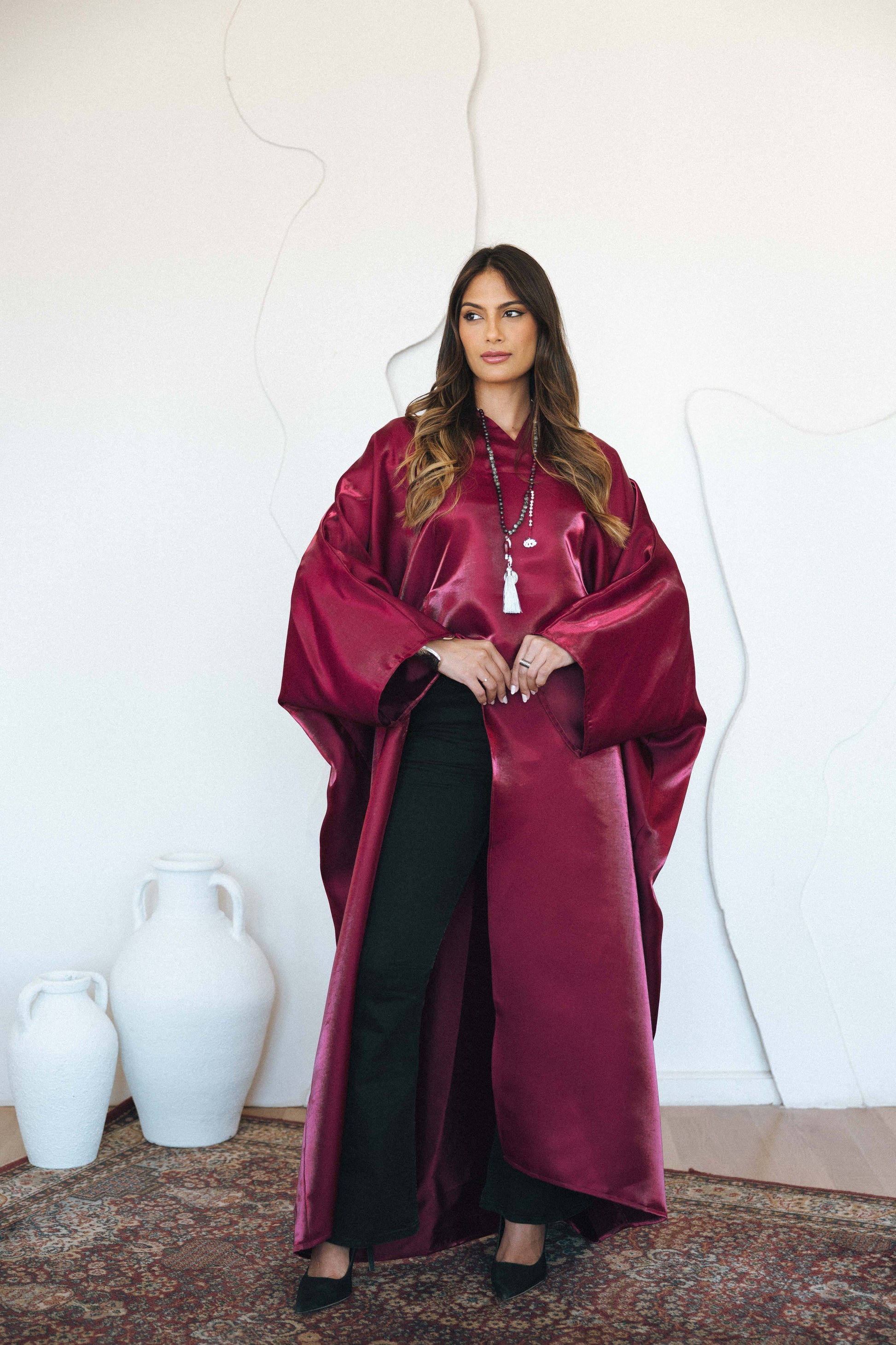 A fluid satin-finish kaftan designed for effortless elegance. Featuring wide sleeves and a relaxed silhouette, this piece drapes beautifully with every movement. The rich colors tone adds a refined statement, ideal for elevated daywear or evening styling.