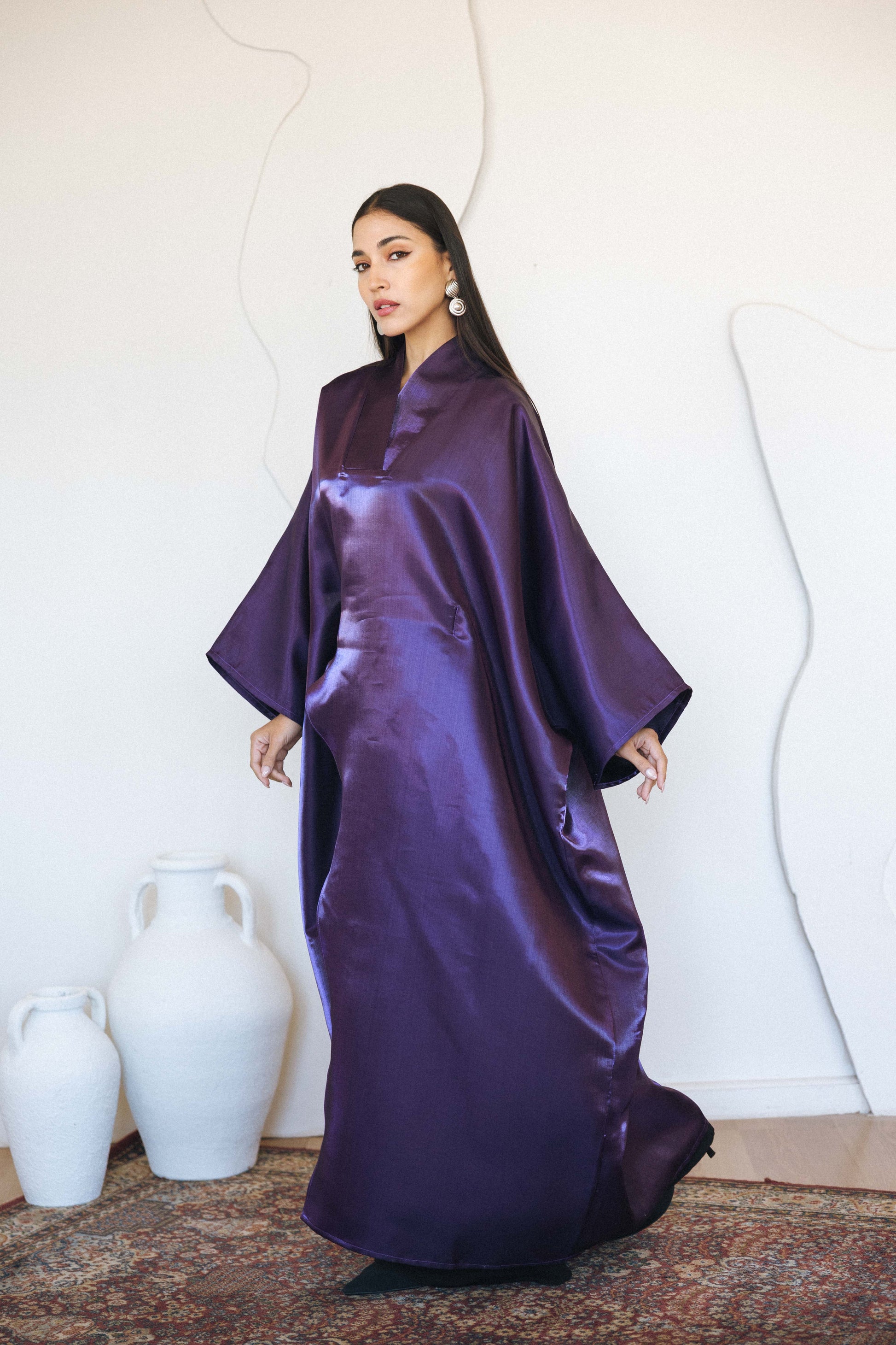 A fluid satin-finish kaftan designed for effortless elegance. Featuring wide sleeves and a relaxed silhouette, this piece drapes beautifully with every movement. The rich colors tone adds a refined statement, ideal for elevated daywear or evening styling.