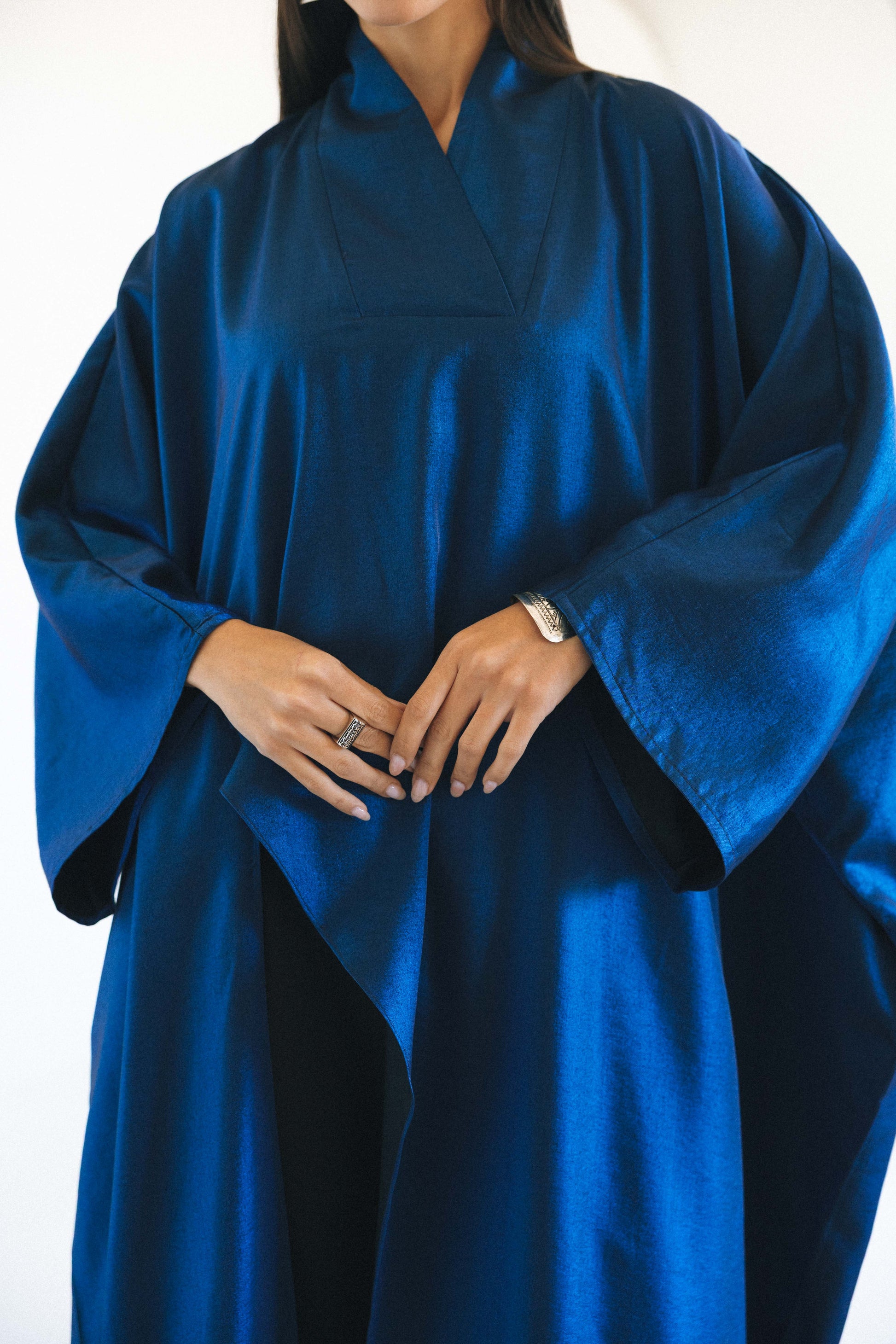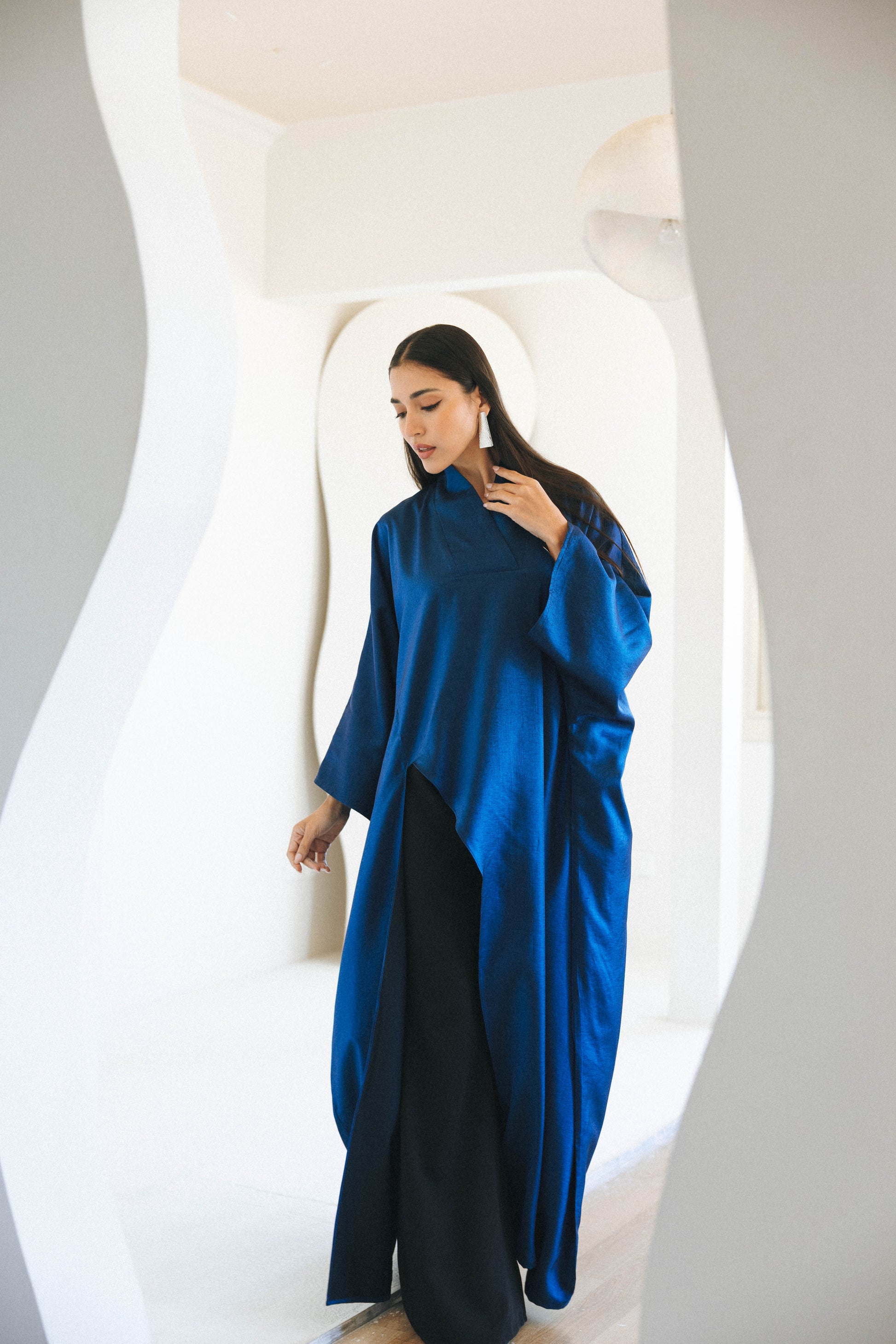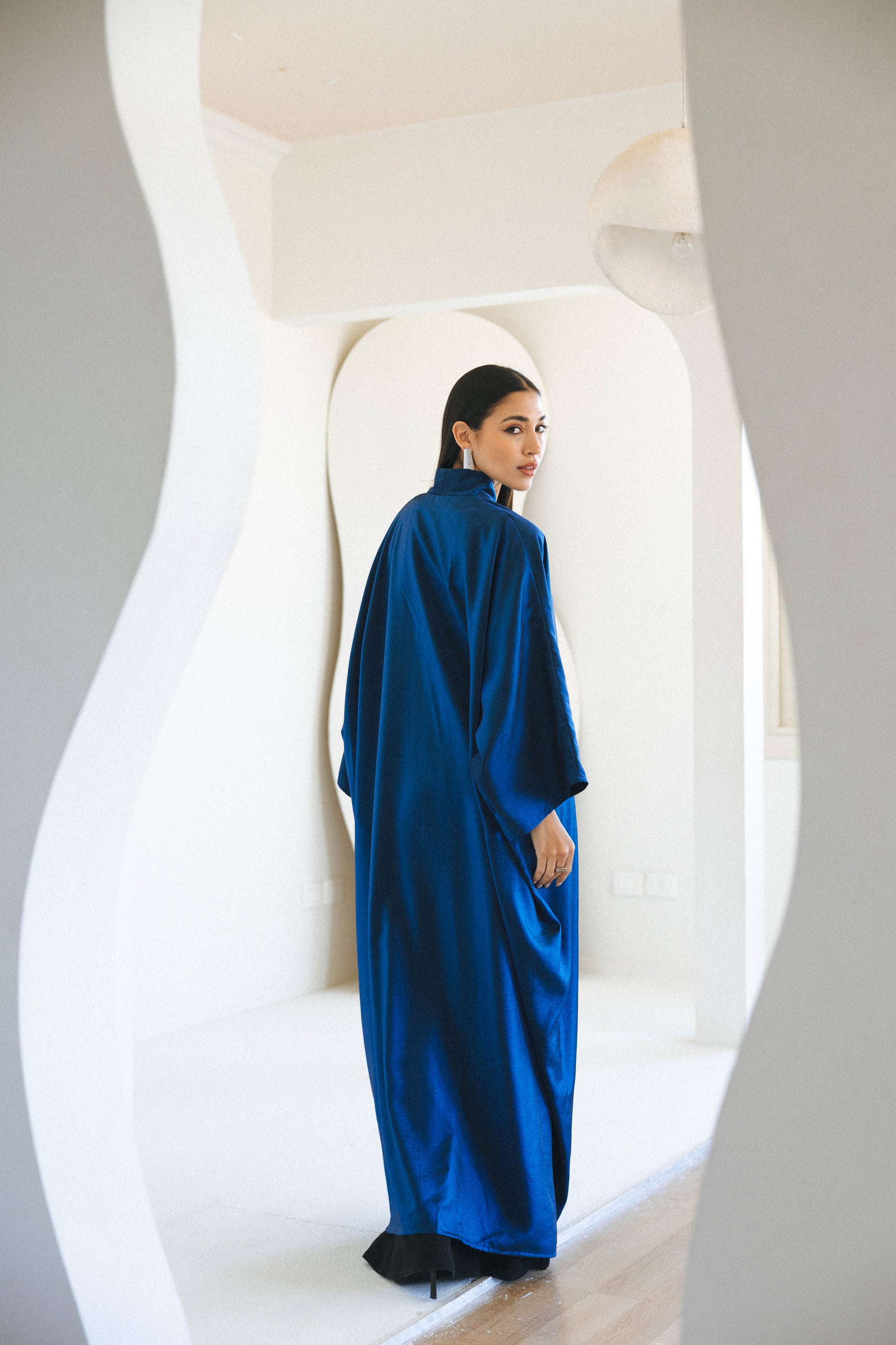 A fluid satin-finish kaftan designed for effortless elegance. Featuring wide sleeves and a relaxed silhouette, this piece drapes beautifully with every movement. The rich colors tone adds a refined statement, ideal for elevated daywear or evening styling.